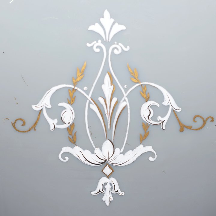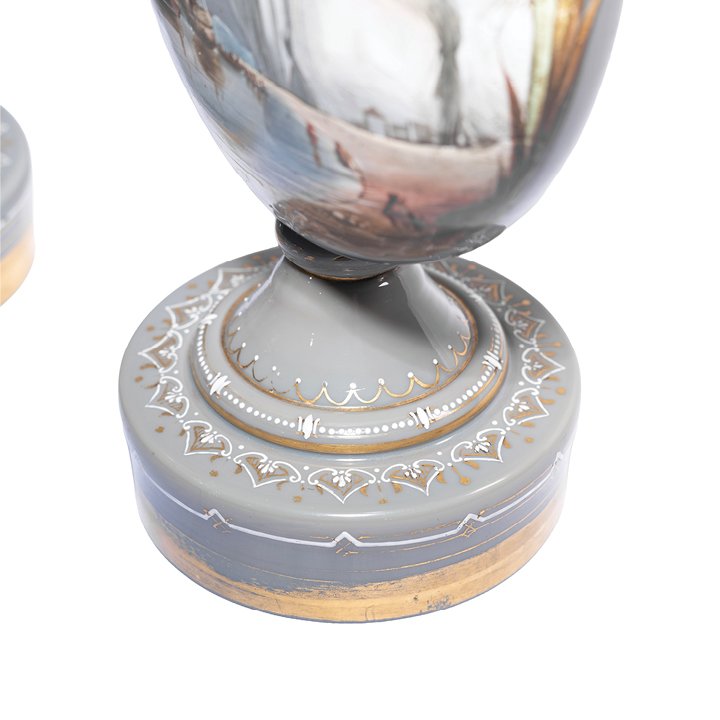 A pair of grey opaline glass vases of baluster form, each adorned with hand-painted enamel of maritime scenes on front sides and scroll cameos at the backs. One shows a single masted vessel moving through open water, while the other presents a group of ships near a coastal formation. The compositions are set against the smooth, opaque grey ground, with gilded bands in Aesthetical style accenting the rims, necks, and bases. Preserved in great antique condition. Minor wear is visible on the gilt parts.
