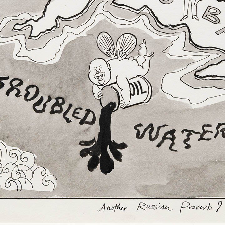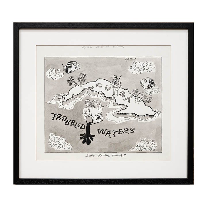 Ink and wash drawing by Michael ffolkes (Brian Davis), titled “Another Russian Proverb?” The composition presents a stylised map of Cuba surrounded by water, with a central figure pouring oil labeled OIL into the sea, forming the phrase TROUBLED WATERS. Additional elements include a rifle-holding figure on the island and two fish with national markings. Annotated along the upper edge: “Russia sends oil to Cuba.” Signed ffolkes at the upper right.