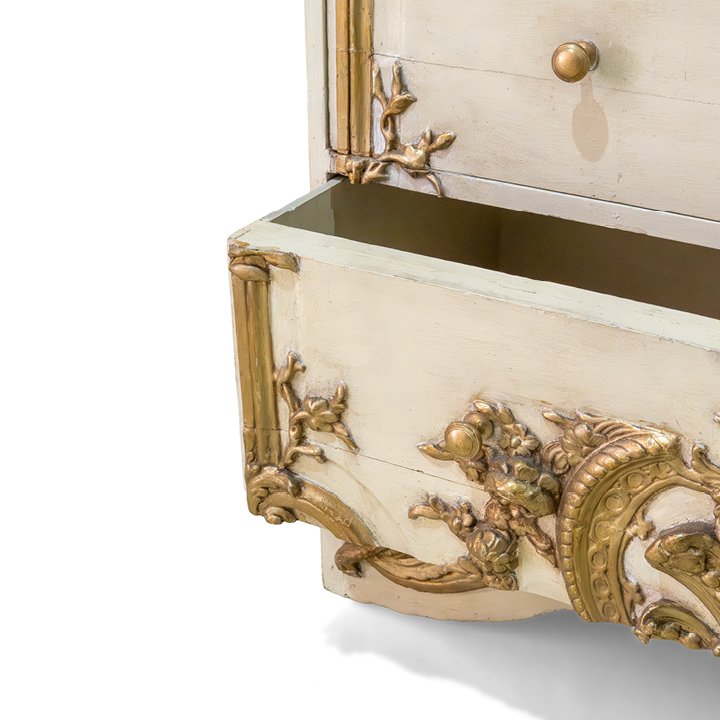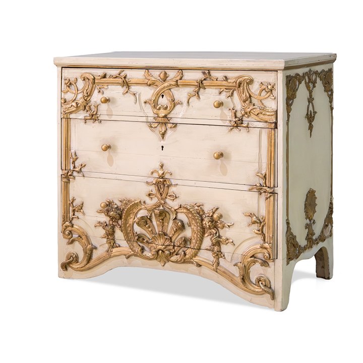 An Italian painted and parcel-gilt chest of drawers, fitted with three long drawers. The front and sides are enriched with applied and carved gilt decoration of scrolling foliage, garlands, and trophies, set against a cream-painted ground. The drawers are arranged in a stepped façade, with shaped apron and bracket supports.
