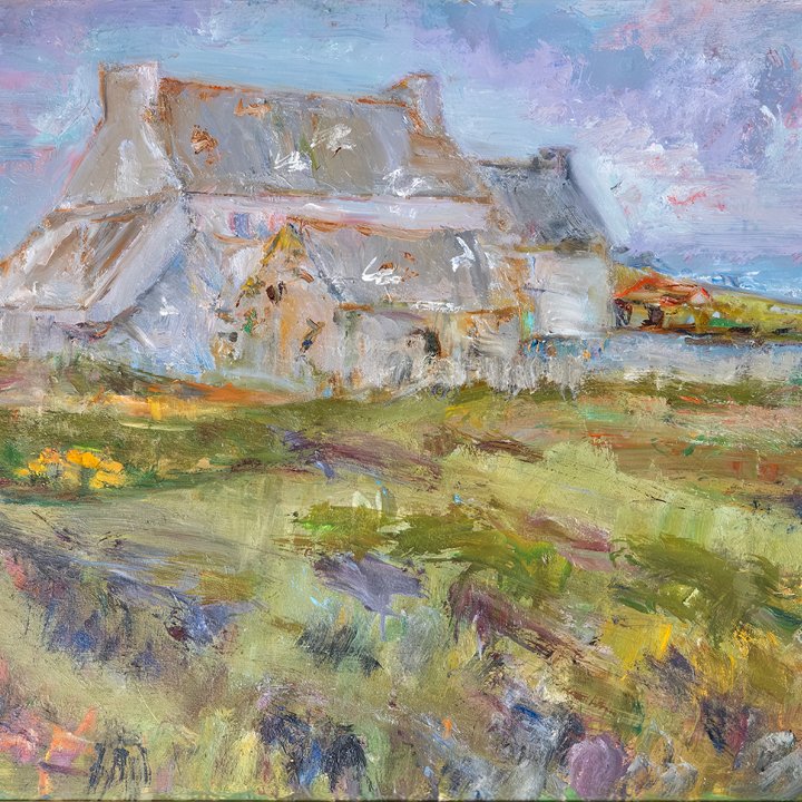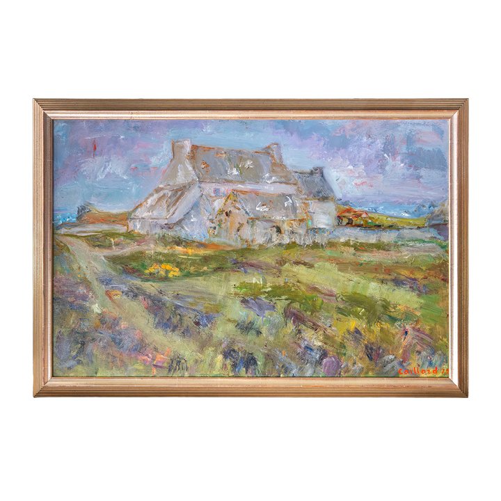 Oil on canvas landscape painting, a work from a late period of Christian Hugues Caillard (1899- 1985), depicting a grey house – a distinctive motif of the artist's body of work during his stay in the Brittany region. The scene is likely takes place in Ouessant Island. Signed and dated lower right: "Caillard (19)72"