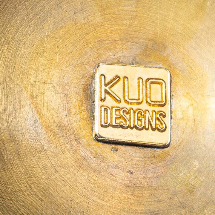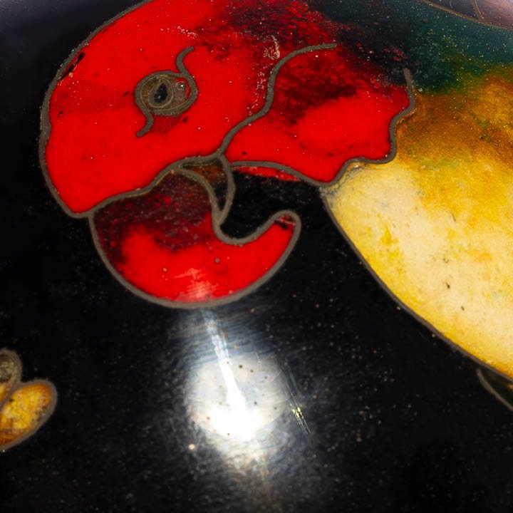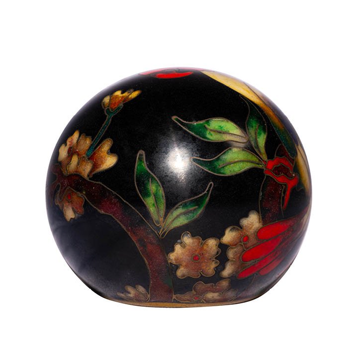 A spherical cloisonne enamel paperweight with a black ground, decorated with stylised parrot floral motifs. The underside with a gilt metal base, stamped KUD DESIGNS. Good condition with minor surface wear consistent with age.