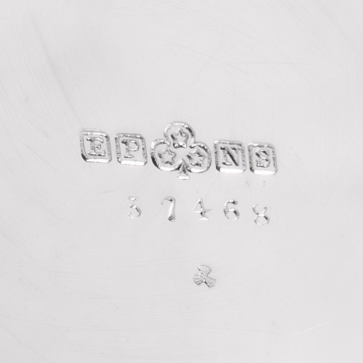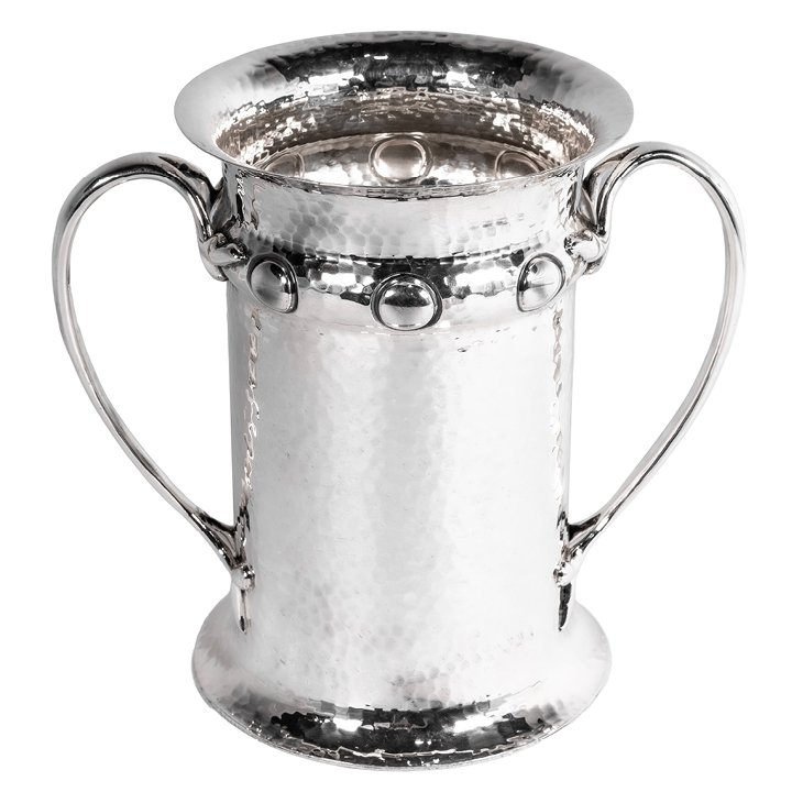 Silver plated drink cooler with a hammered surface and twin loop handles. The cylindrical body is decorated with an applied band of raised roundels below the flared rim. The underside carries stamped marks.