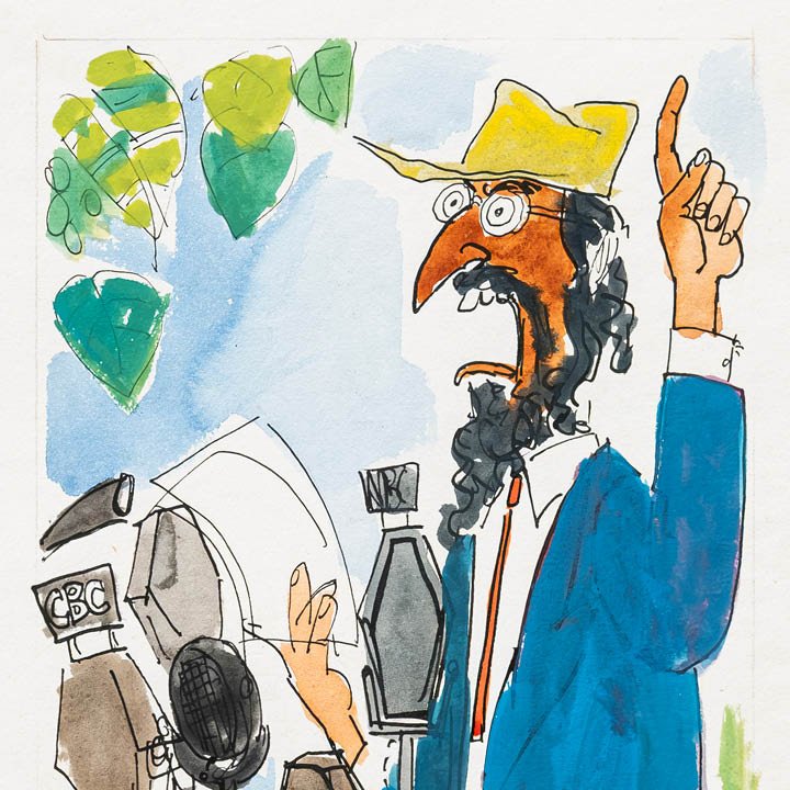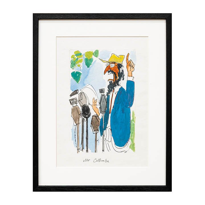 Ink and watercolour drawing by Michael ffolkes titled “Mr. Castrumba.” The work depicts a bearded speaker addressing an array of microphones, including one labelled CBC, with an outdoor backdrop of foliage and sky. The figure is titled below the image as Mr. Castrumba, a reference to Dr Abdul Ngong Castrumba, the fictional satirical character created by British columnist Peter Simple for The Daily Telegraph.