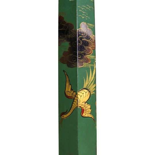 A pair of English Chinoiserie painted wood floor lamps. Green background with gilt and red decoration depicting flowers, butterflies and cranes amongst the clouds. Lampshades in floral pattern made of vintage Indian sari fabrics. Both lamps are perfectly wired with a TYPE G plug.