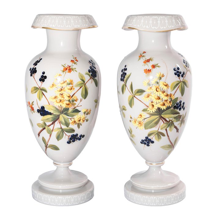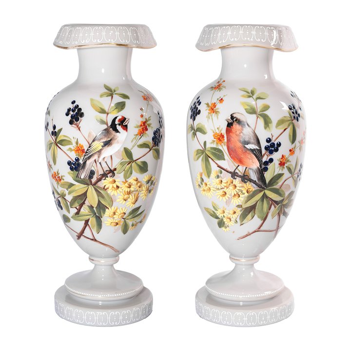 Pair of whimsical pastel-grey opaline glass vases of stemmed baluster shape with flared rims. Decorated with hand-painted enamel birds on branches on front sides and foliage on the back sides. The rims and the bases are adorned with Aesthetical style pattern in white, partially gilt. Preserved in great antique condition.
