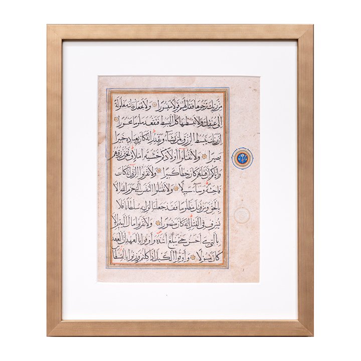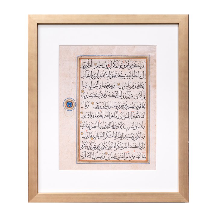 A set of five Qur’an folios from a Safavid. Arabic manuscript on paper, each folio written double-sided with ten lines of bold black naskh script within orange, blue, and gold ruled borders. The text is punctuated with gold rosette verse markers and accompanied by polychrome and gilt marginal medallions. Newly framed under museum glass.