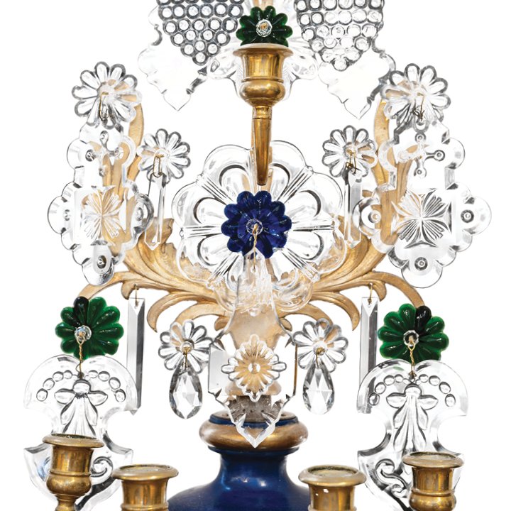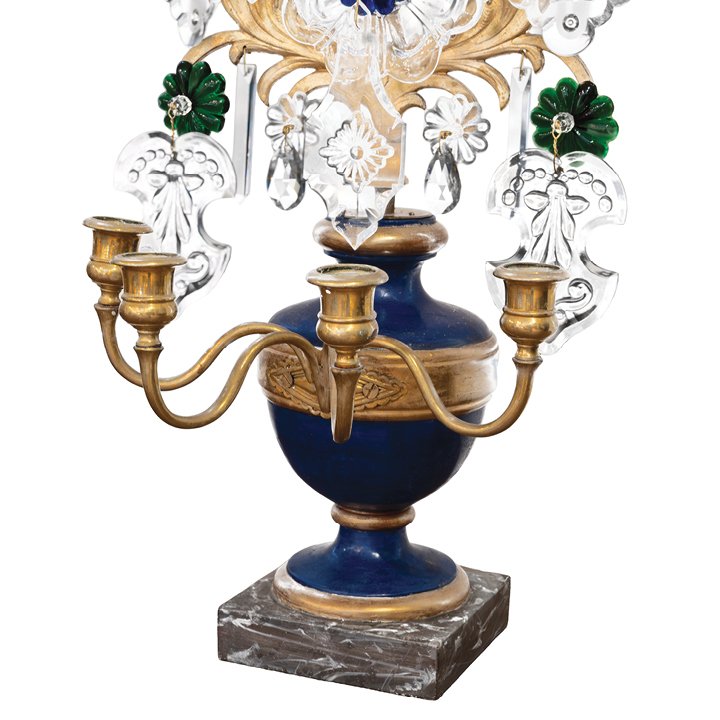 The set has been fully restored. The bases were stabilized with plaster fillings and the hand-painted and gilt surfaces carefully retouched. All crystal ornaments were re-attached using modern wiring, preserving of the original decorative scheme.