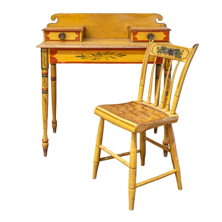 Fine classical polychrome paint decorated pine dressing table with matching Federal fancy yellow painted Windsor side chair, attributed to Maine, circa 1825–1840. The dressing table features a rectangular top with a raised back, fitted with two small drawers above a single frieze drawer, retaining original hardware. Raised on turned tapering legs with painted banding and floral motifs.