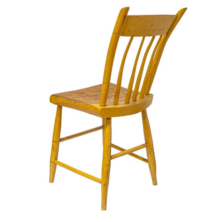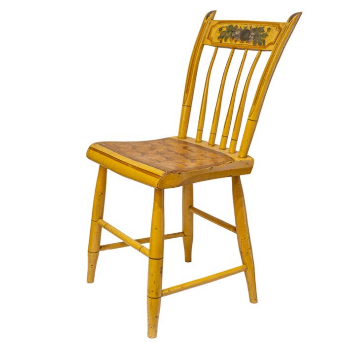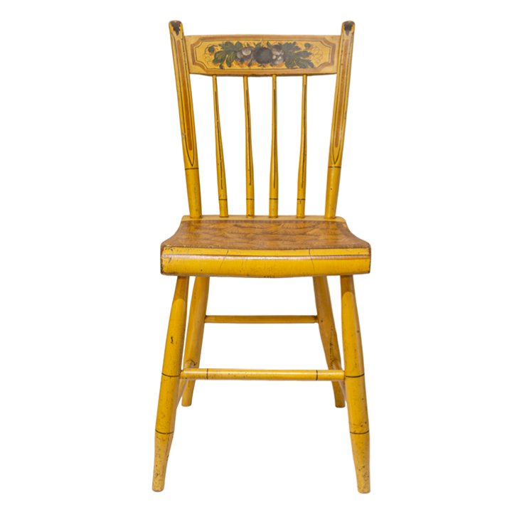 The accompanying Windsor chair is inscribed on the underside of the seat William H. Littlefield and features a shaped plank seat, slender turned legs, and a painted floral crest rail. The chair corresponds in period, palette, and decorative character, forming a cohesive set.