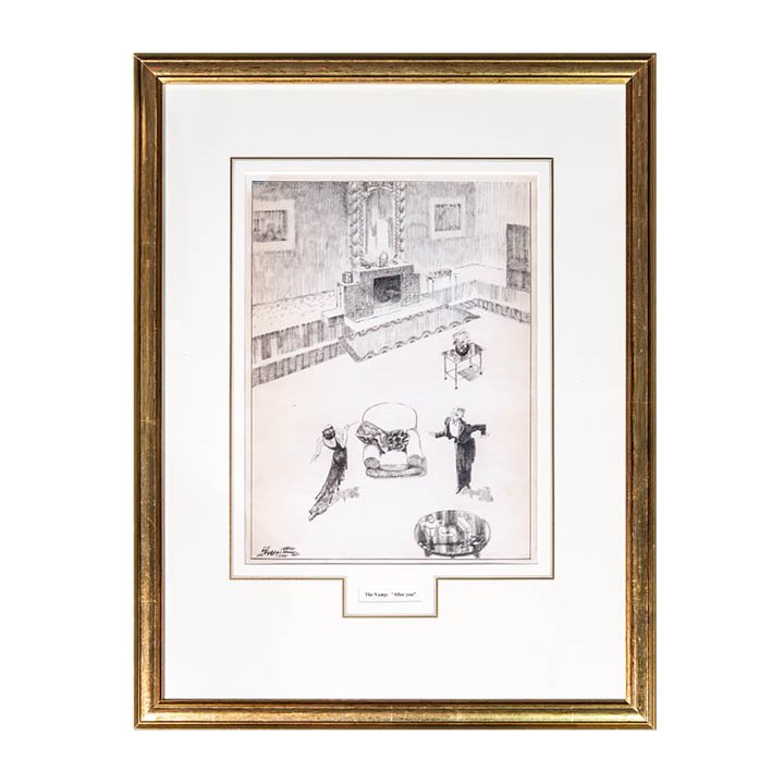 Pen and ink drawing by Robert Stewart Sherriffs, titled “The Vamp: ‘After You.’” The composition presents a large interior space viewed from above, showing a fireplace, furnishings, and two figures positioned near an armchair and a table. One figure wears evening dress and holds a cigarette holder; the other stands opposite in formal attire. The work is signed Sherriffs at the lower left.