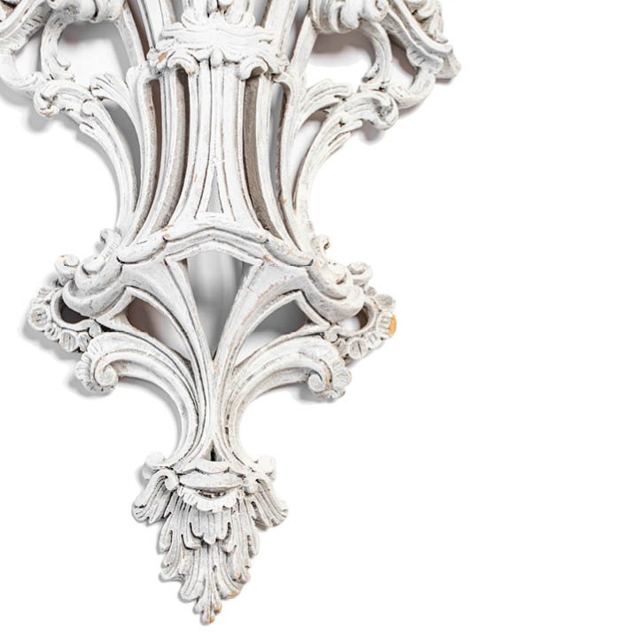 Carved wood and white gesso console wall brackets in Rococo Revival style. Each features semi-circle curved shelf over ornate base with distinctive rocaille scrolls decoration. May be purchased either together as a set or separately.