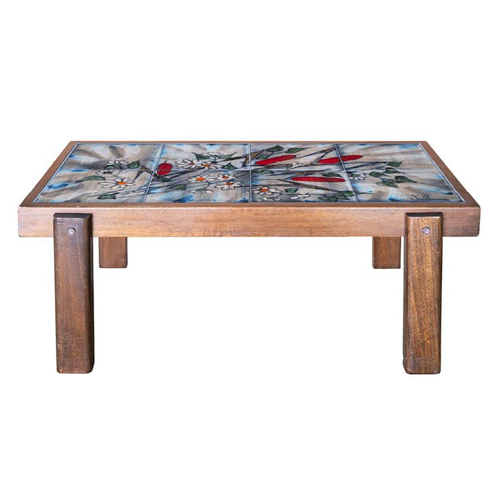 Wooden Coffee Table with Floral Motif Tile Top