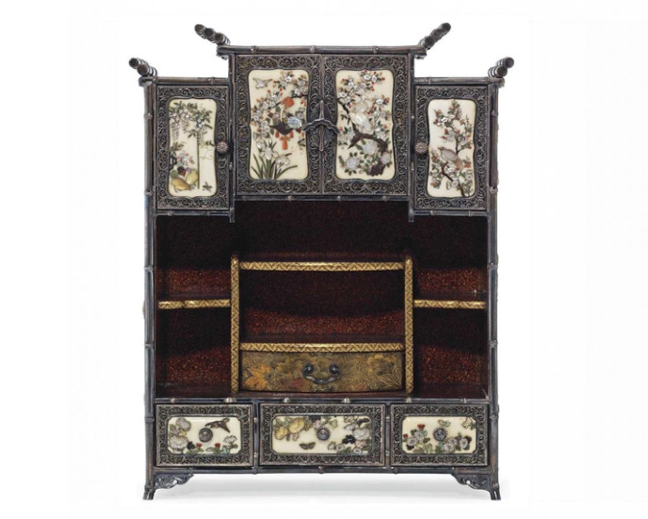 The shibayama zogan (inlay), as it is known amongst the Japanese, is an art technique consisting of incrusting diverse source materials into a ground base material, particularly, Japanese lacquer. The technique is often mentioned as being an artistic achievement of the Meiji Period in the second half of the 19th century; however, this is not true, as its origins can be traced to almost 100 years earlier, in the late 18th century Edo Period. During the Meiji era, the technique had fully been perfected, and the shibayama style reached its highest degree of commercial development. The shibayama decorated pieces gained additional recognition, resulting in a large number of exhibitions displaying both the older and newer items, especially outside of Japan. Beginning with the Exposition Universelle à Paris in 1867, the western world came to love this new oriental artistic style and inevitably a boom trade followed.