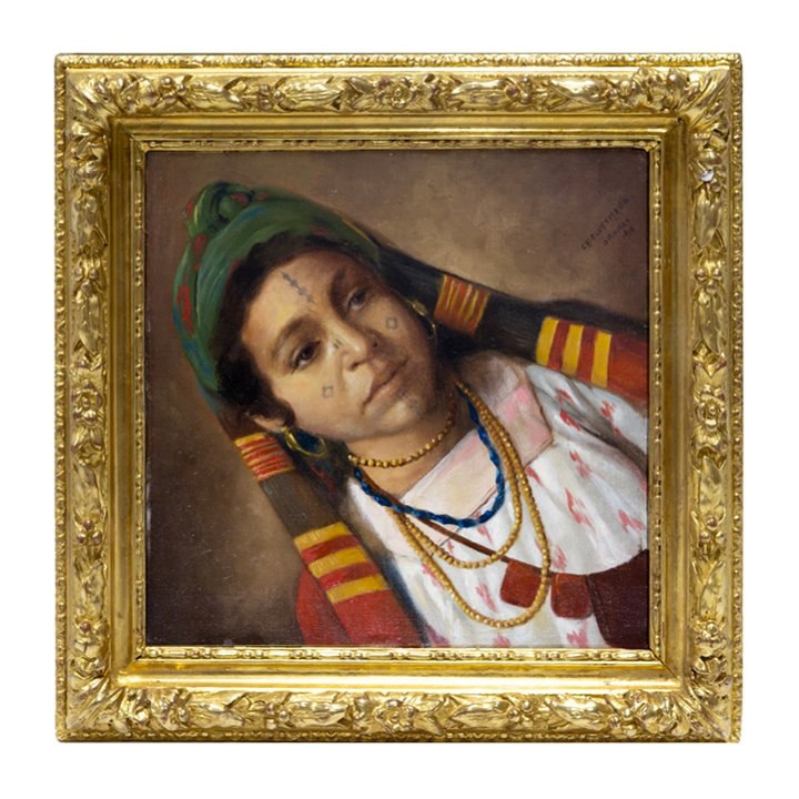 A striking portrait of a girl in traditional North African dress, depicted with finely modeled features, symbolic tattoos, and layered jewelry. The composition, conceived to be displayed on the diagonal, emphasizes the sitter’s tranquil, inward gaze and the geometries of her headdress. The vivid palette—ochres, reds, and greens—contrasts with the subtle modeling of flesh tones and the careful detailing of embroidered fabric and beadwork. Signed, titled, and dated in the right: "Ch. Clvytmans, Oranan, 1916."