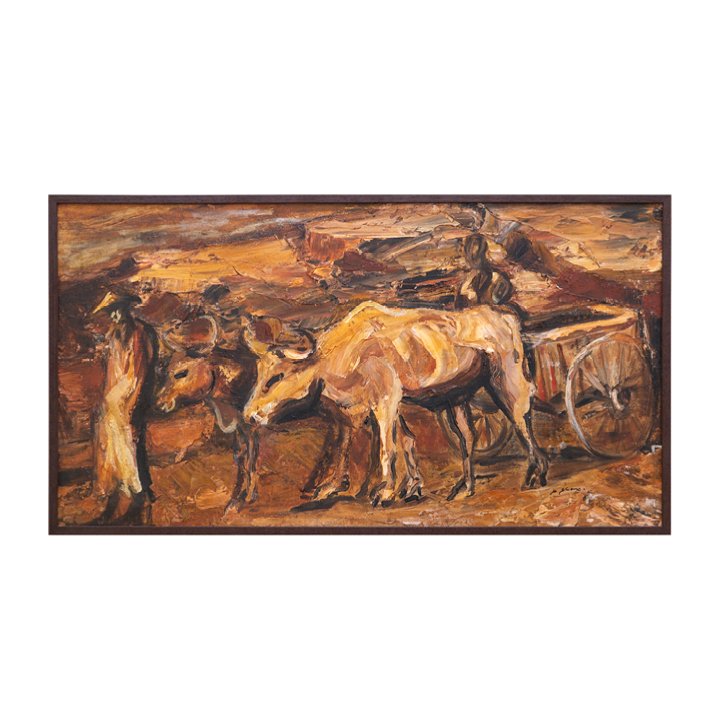 "Ox Drovers" – a distinctive yet rare painting by South African sculptor Stella Shawzin. Signed on the lower right. Newly framed.
