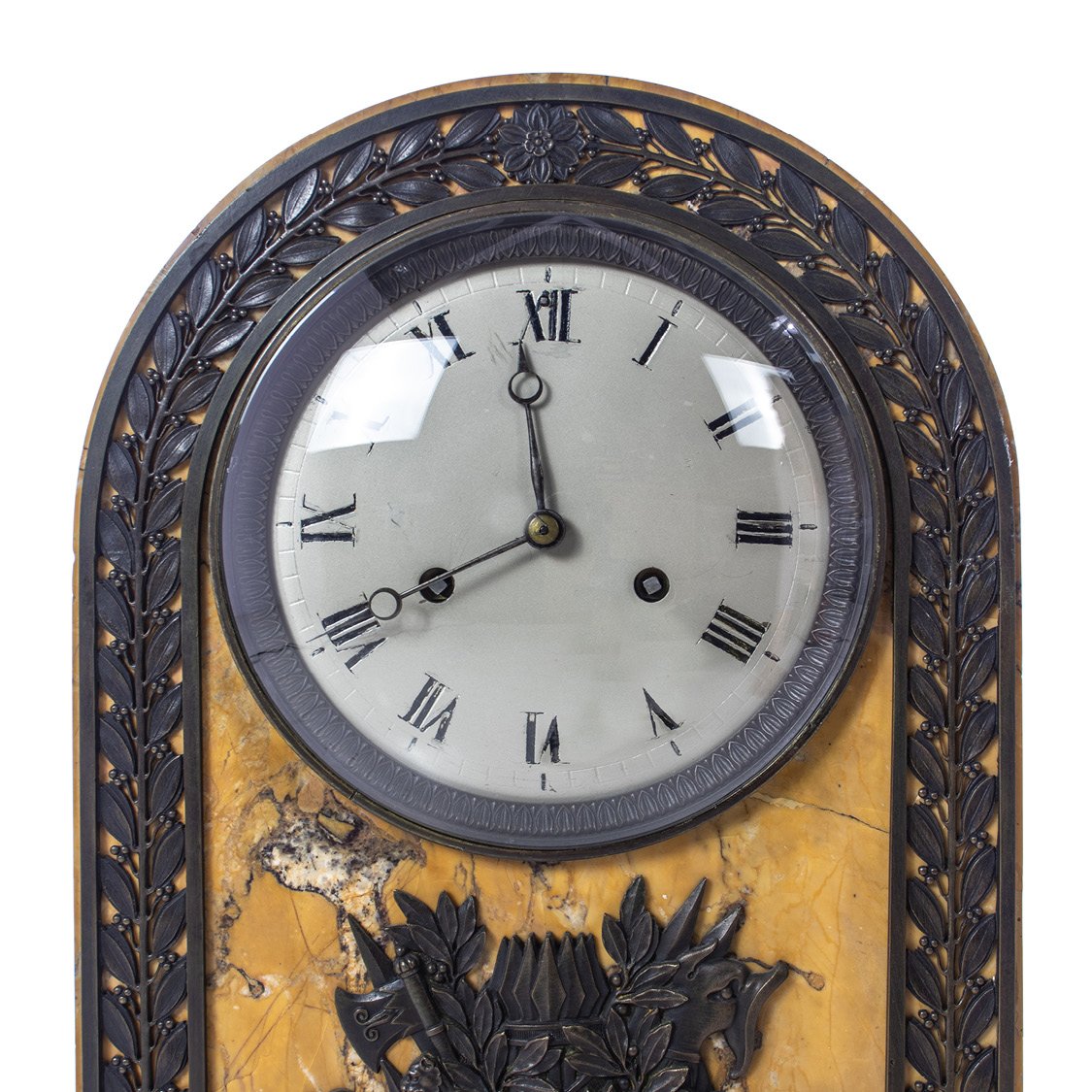 Mantel clock in the form of an antique bollard in sienna marble, with a plinth on block feet. It is adorned with patinated bronze relief depicting a trophy and a portrait medallion. The plinth and clock body are framed in foliage motifs. The sides feature mounts in sword shape. The white enameled dial within the glass case features Roman numerals and includes 2 clock hands. The movement is signed “Denière Paris”.