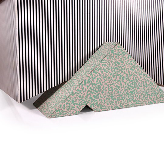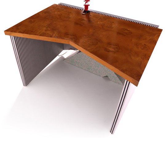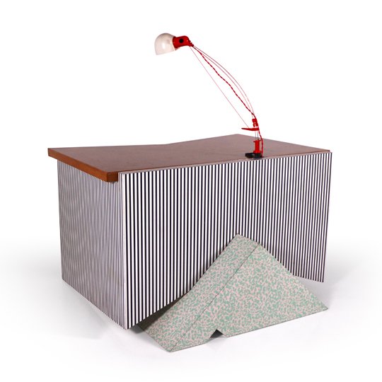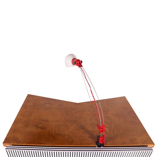 A playful Memphis desk with a triangle base and a red lamp attached. The main structure is in white and black stripes and the triangle base in celadon spots on white. The top is made of natural solid wood. The post modern Memphis furniture was dominant in the 1980's, in Milano, known for their freedom of expression designs, dizzying patterns and bold colors.