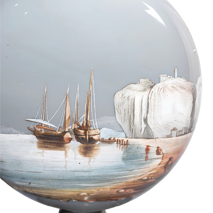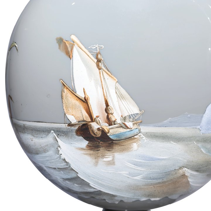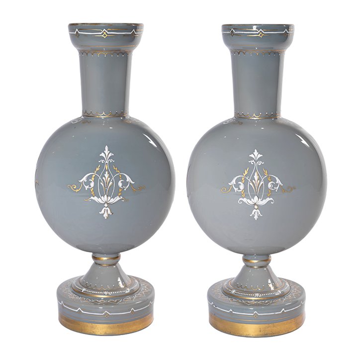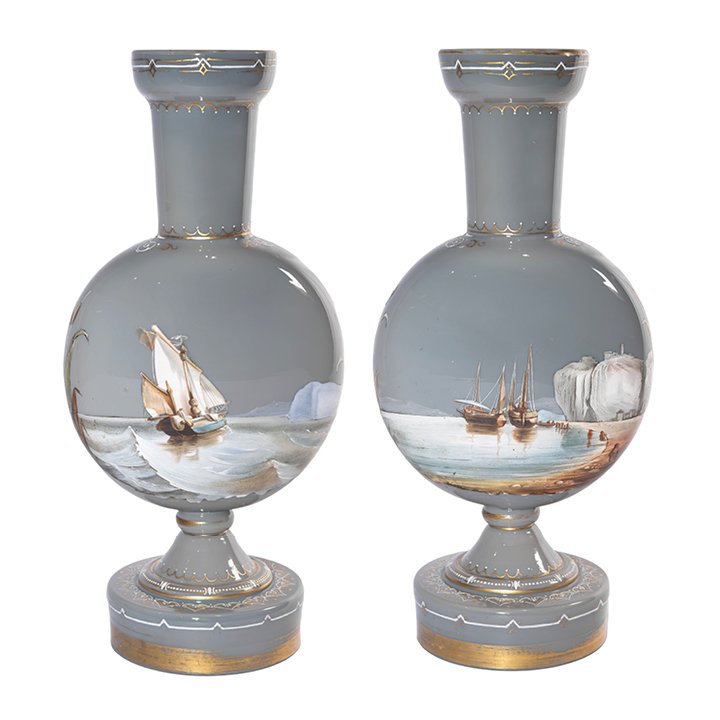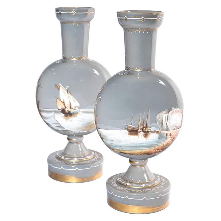 A pair of grey opaline glass vases of baluster form, each adorned with hand-painted enamel of maritime scenes on front sides and scroll cameos at the backs. One shows a single masted vessel moving through open water, while the other presents a group of ships near a coastal formation. The compositions are set against the smooth, opaque grey ground, with gilded bands in Aesthetical style accenting the rims, necks, and bases. Preserved in great antique condition. Minor wear is visible on the gilt parts.