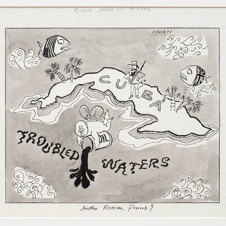 Ink and wash drawing by Michael ffolkes (Brian Davis), titled “Another Russian Proverb?” The composition presents a stylised map of Cuba surrounded by water, with a central figure pouring oil labeled OIL into the sea, forming the phrase TROUBLED WATERS. Additional elements include a rifle-holding figure on the island and two fish with national markings. Annotated along the upper edge: “Russia sends oil to Cuba.” Signed ffolkes at the upper right.