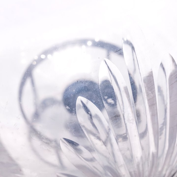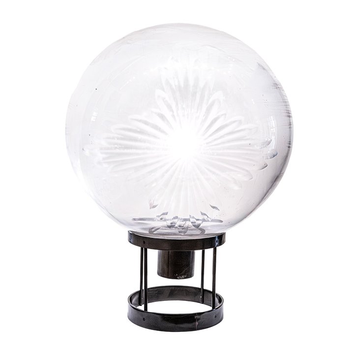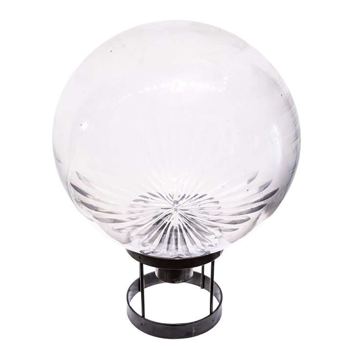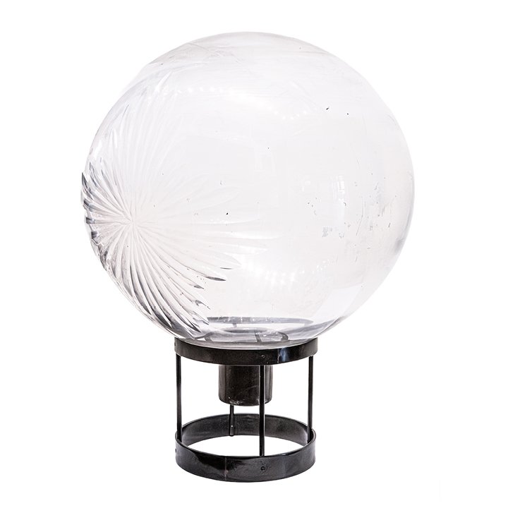 A large blown-glass apothecary globe with a starburst etching on the front side. The etched decoration is distinctive in design, and the surface shows textural irregularities consistent with age.