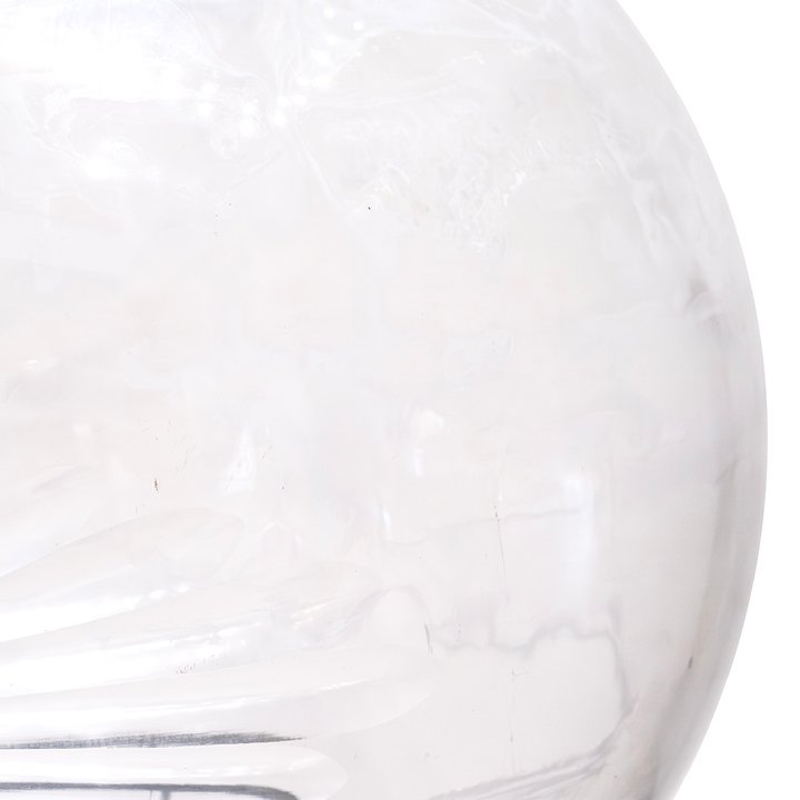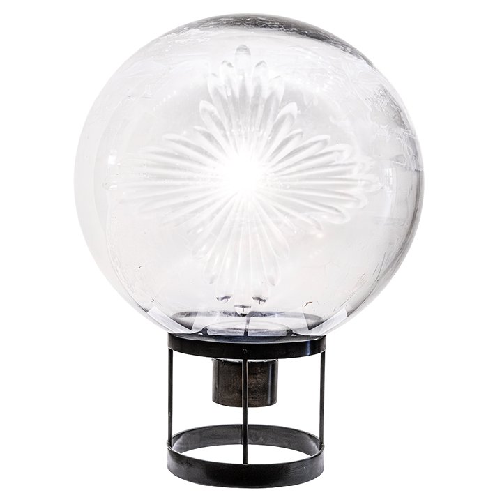 An extra-large apothecary globe in clear blown glass, with a deep starburst etching on the front side. The etched surface has visible wear and texture due to aging.