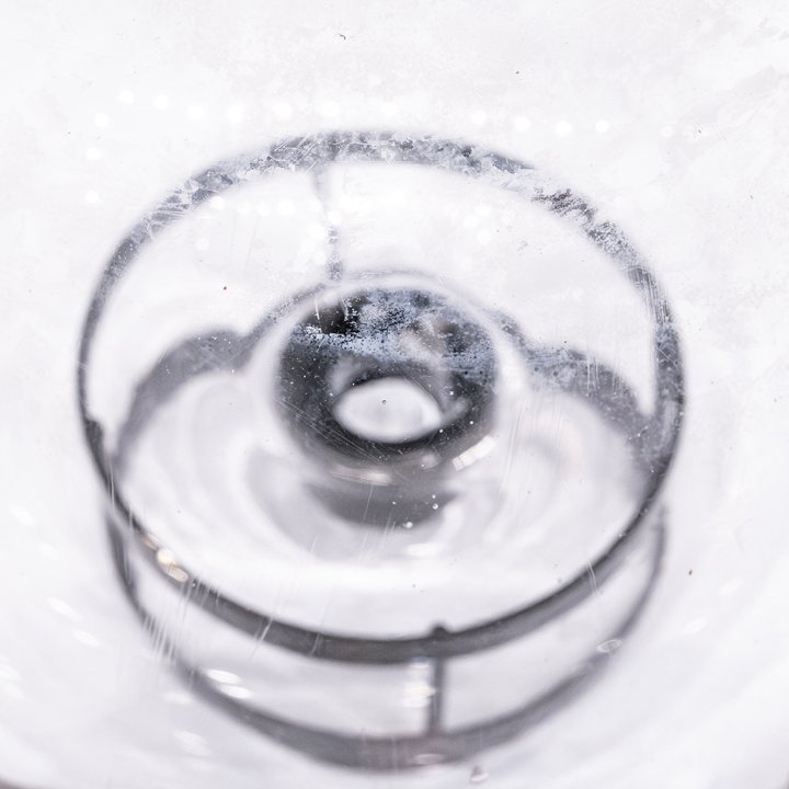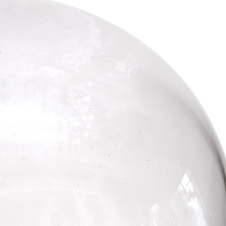 A clear blown-glass apothecary globe in a simple spherical form with open base. The surface shows visible signs of aging and retains a plain, undecorated finish.