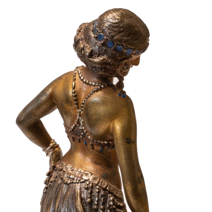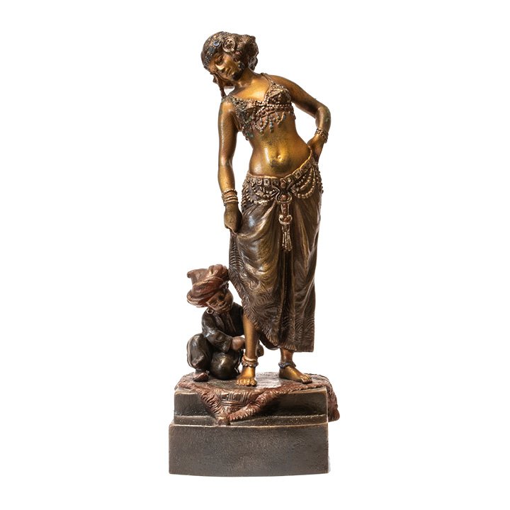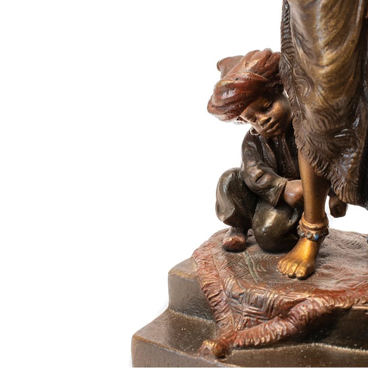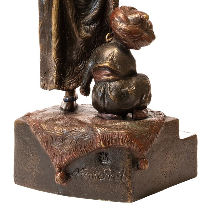 A bronze figurine of a woman and child on a square base. Fine detailing in the features, clothing, and the rug underneath them. Signed "Nam Greb" at the back of the base, maker is 'Franz Bergman' who would often sign his name in reverse.