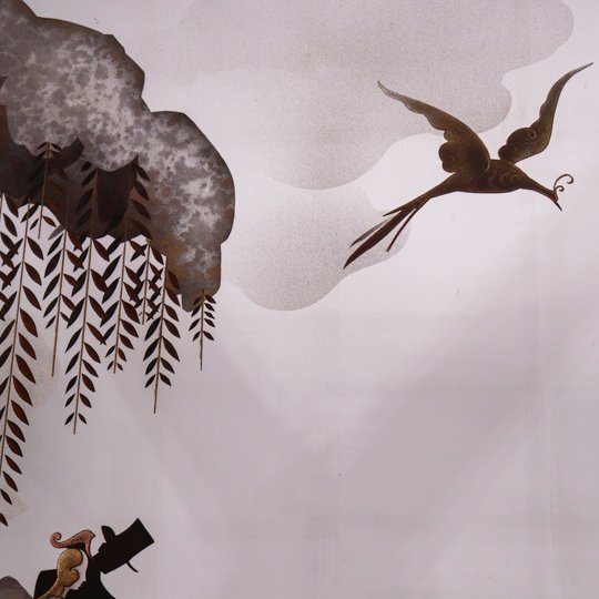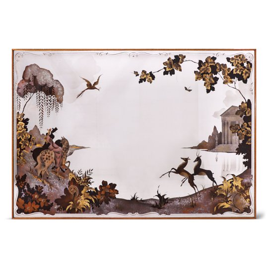 A large Art Deco mirror with a reverse painting of a landscape with figures of people, animals, and floral motifs with a fine gilt frame.