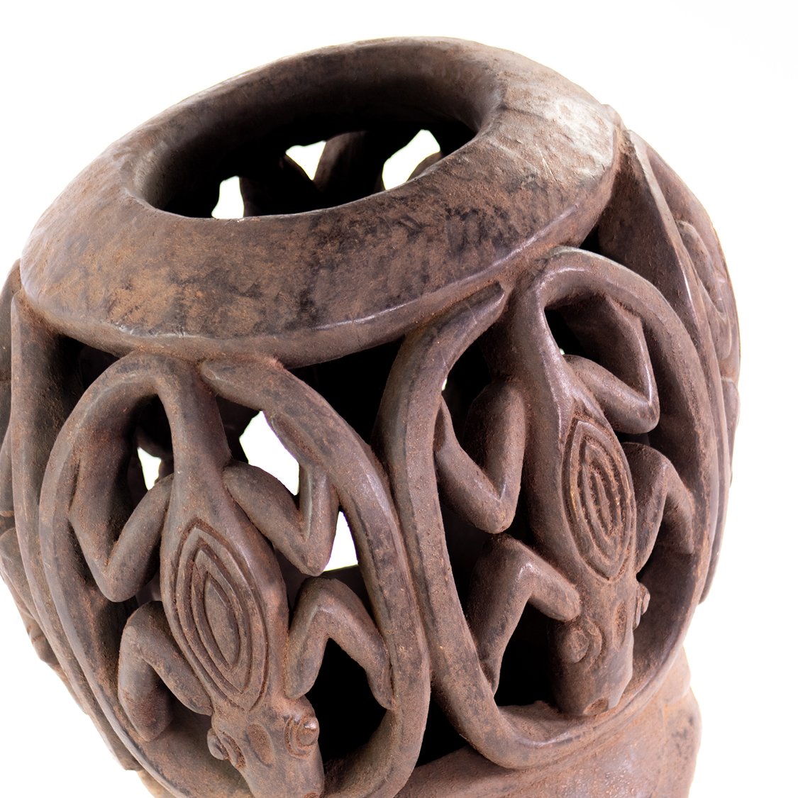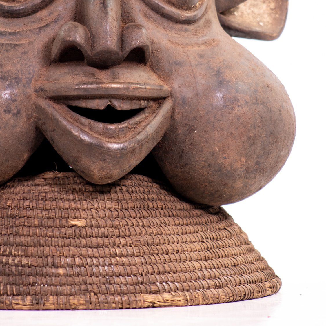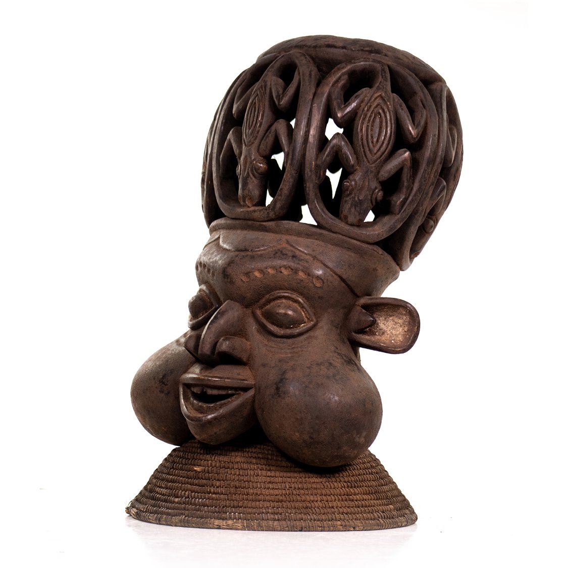 Helmet mask from Bamileke Kom / Bekom / Bamoun culture, with distinctive facial features. Decorated with lizard motifs on the top.
