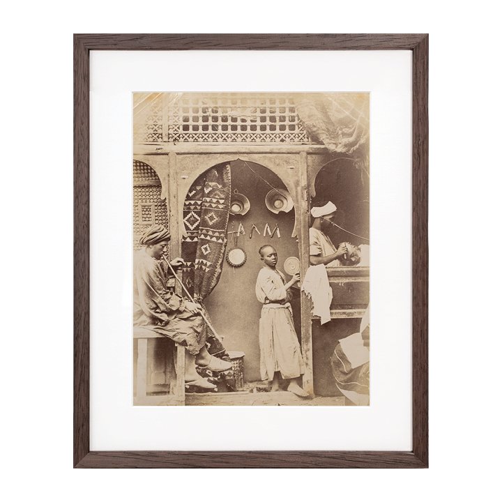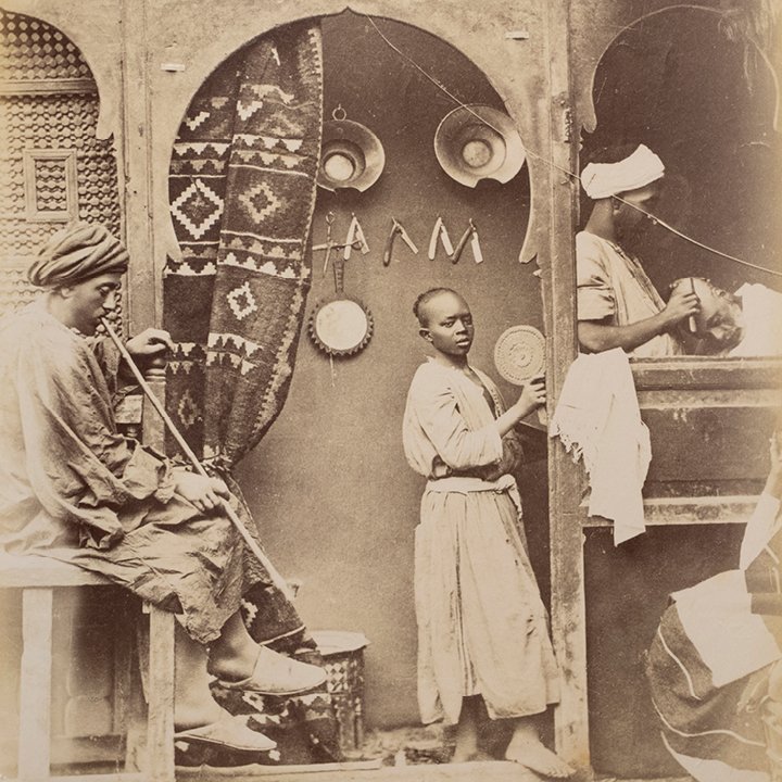Antique albumen print, an enviromental portrait of people at the barber shop, probably taking place at Bulak district, Cairo. The print does not hold any signatures, and the composition was printed by studios of Zangaki Brothers and Abdullah Freres in different years. Attribution of the photographer and the origin of the negative are unclear: some sources suggest that it could be created by Otto Schoefft (1833-1900), other refer to Emile Bechard. Slight signs of wear and fading. Newly framed.