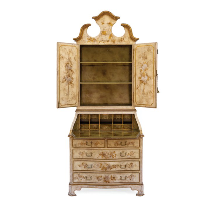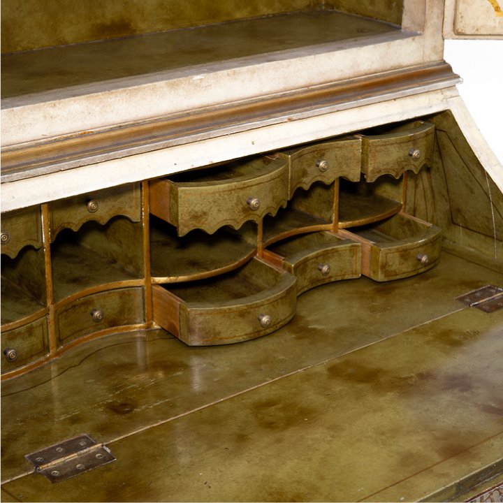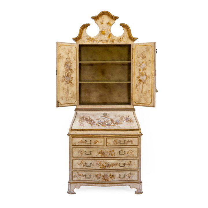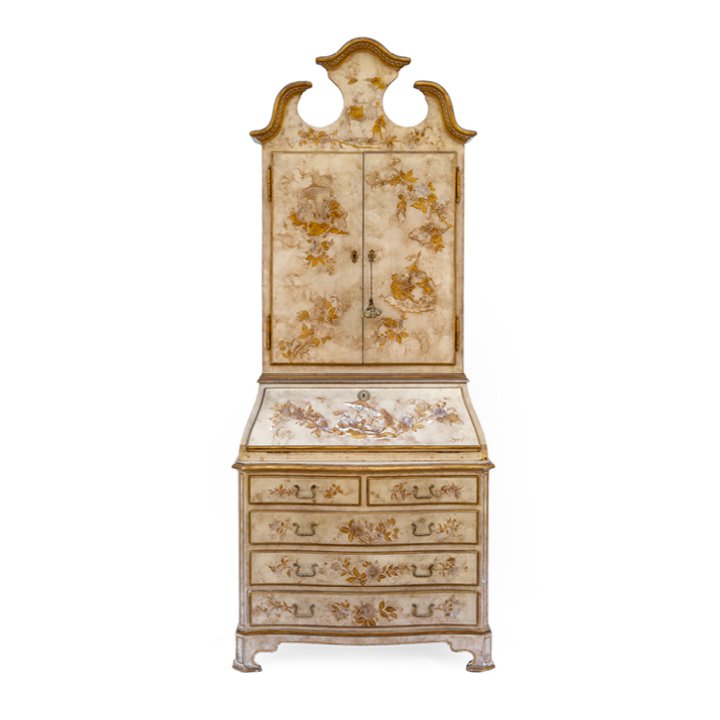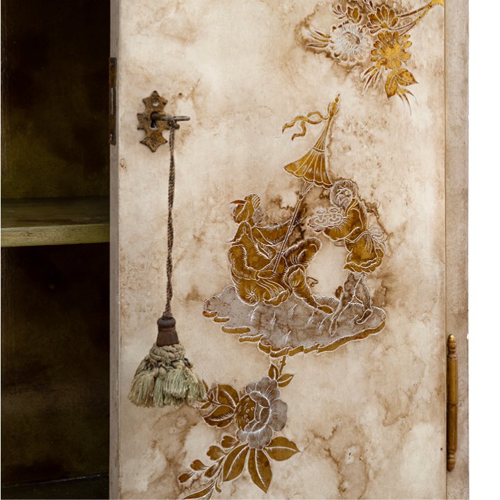 Beige-lacquered bureau cabinet adorned with gilded, Oriental-inspired motifs. The piece is composed of two sections: the lower section features a hinged top and four rows of drawers, the upper section includes two aligned drawers separated by a ledge, hinged doors, and interior shelving.Preserved in great vintage condition, some wear and minor gilding losses are present, consistent with its age. Key included.