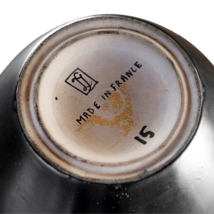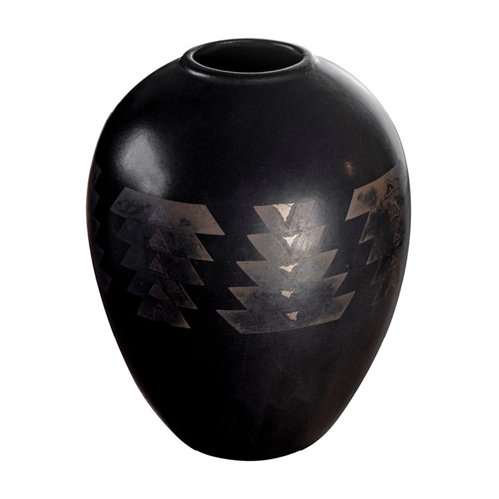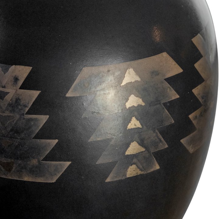 Art Deco vase in black with hand-painted geometric pattern. The sign of creator is placed on the bottom.
