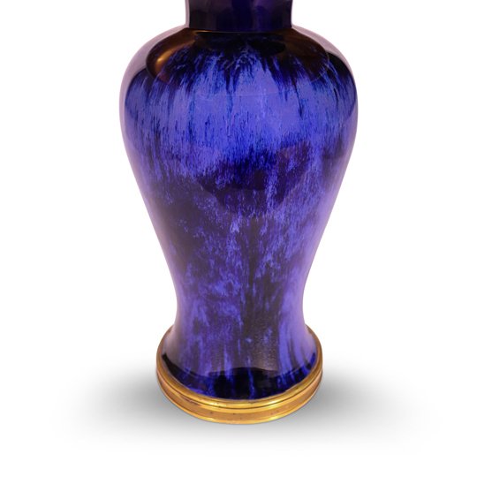 A classic vase-shaped table lamp with electric blue tones, made of glazed ceramic. Embellished with a gilded bronze base at the base and top border. A newly made shade in cream color.