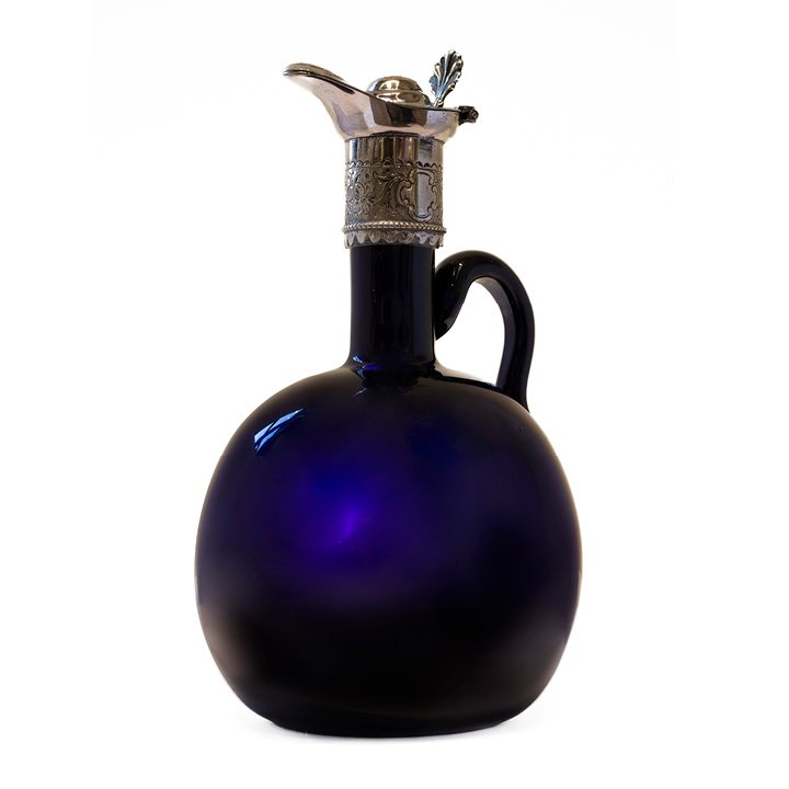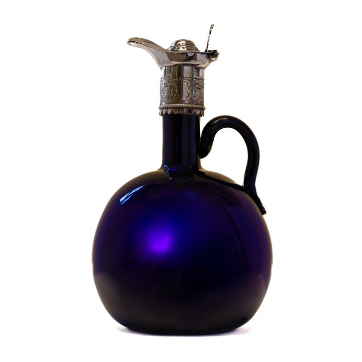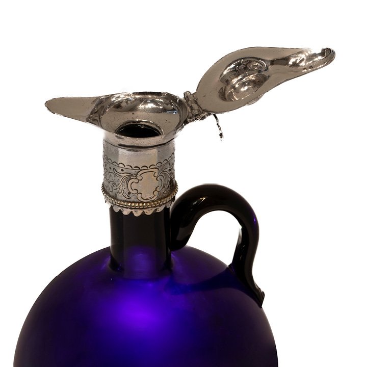 Early Victorian dark blue decanter dating around the mid 19th century. The decanter is hand blown with silver plated lid, and mounts with visible decoration. The form of the glass bottle is referred to as "bocksbeutel", made for importing specific beverages, known in Germany and Portugal.