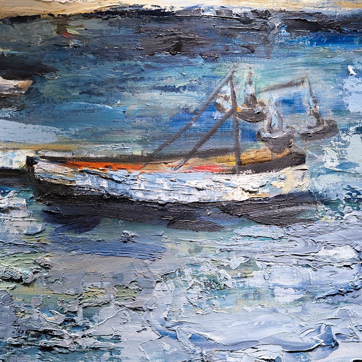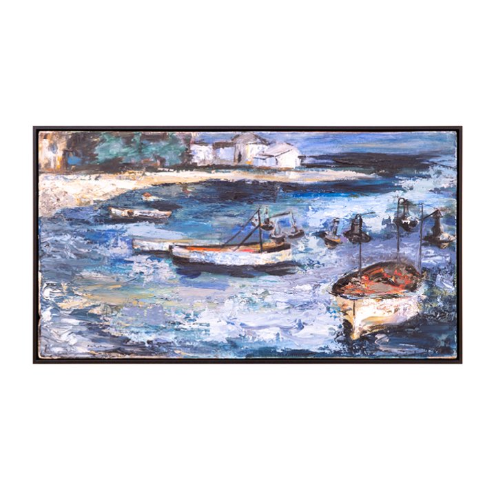 "Boats Docked by the Shore" – beautiful vibrant landscape by South African sculptor Stella Shawzin – a testament of the artist's heritage. Signed on the lower left, newly framed.