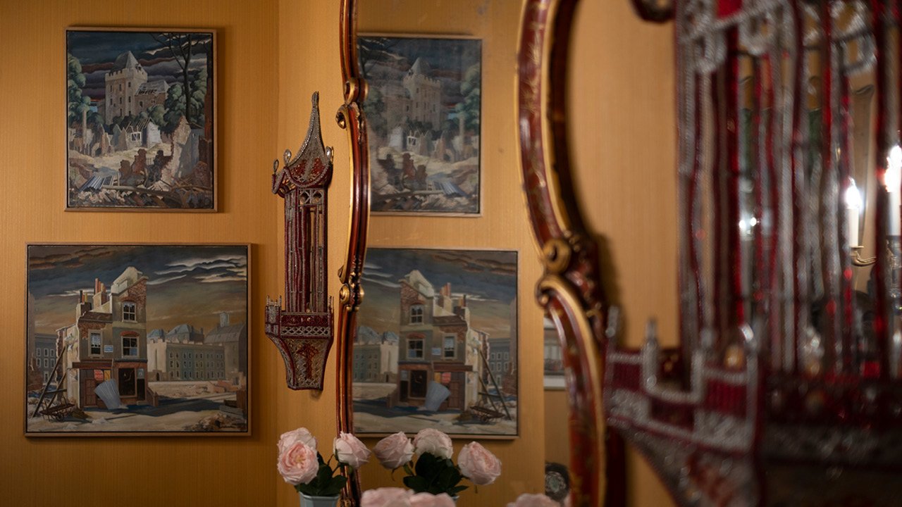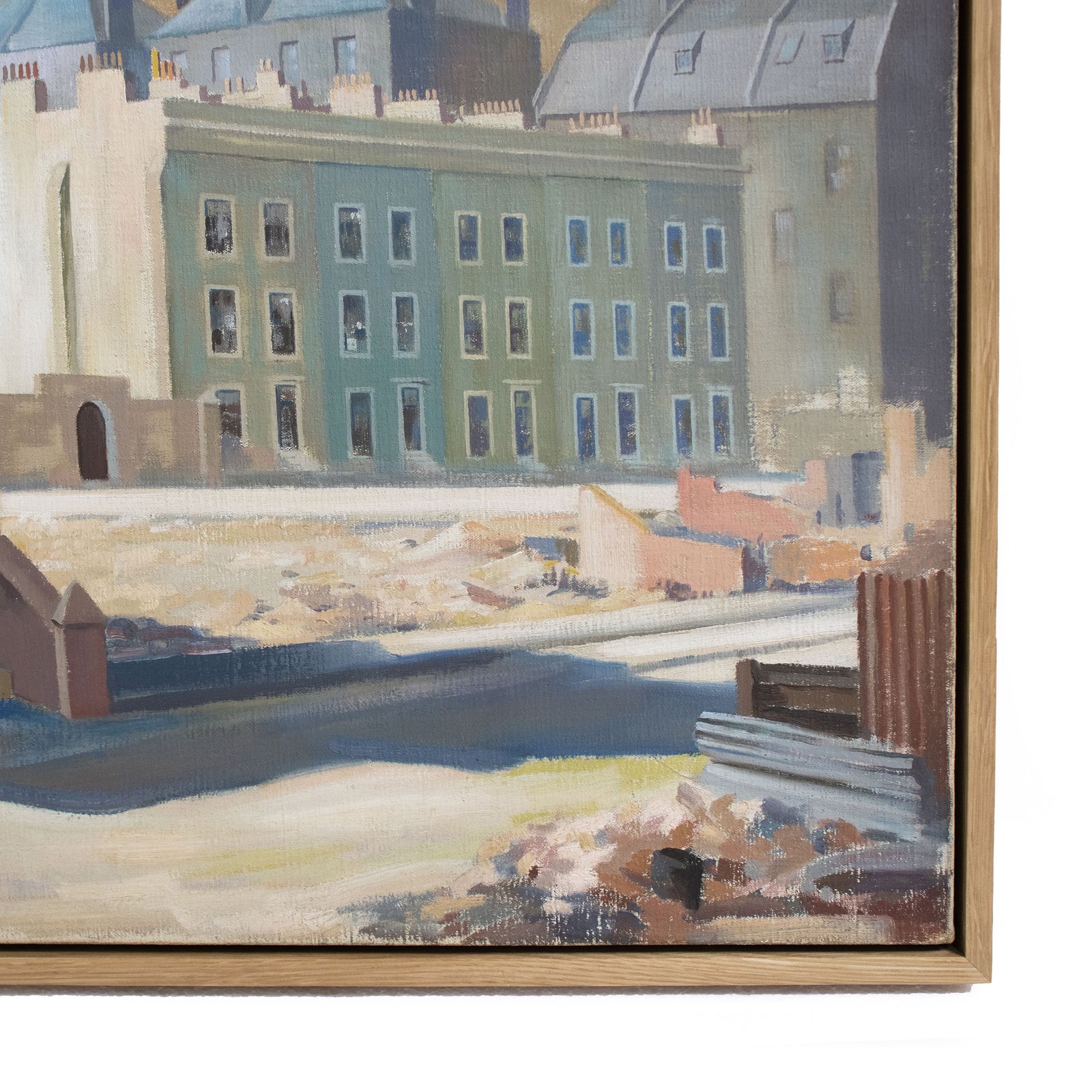 Mid-Century painting depicting a view of the building destroyed by bombs. The scene shows damages during WW2 in London.