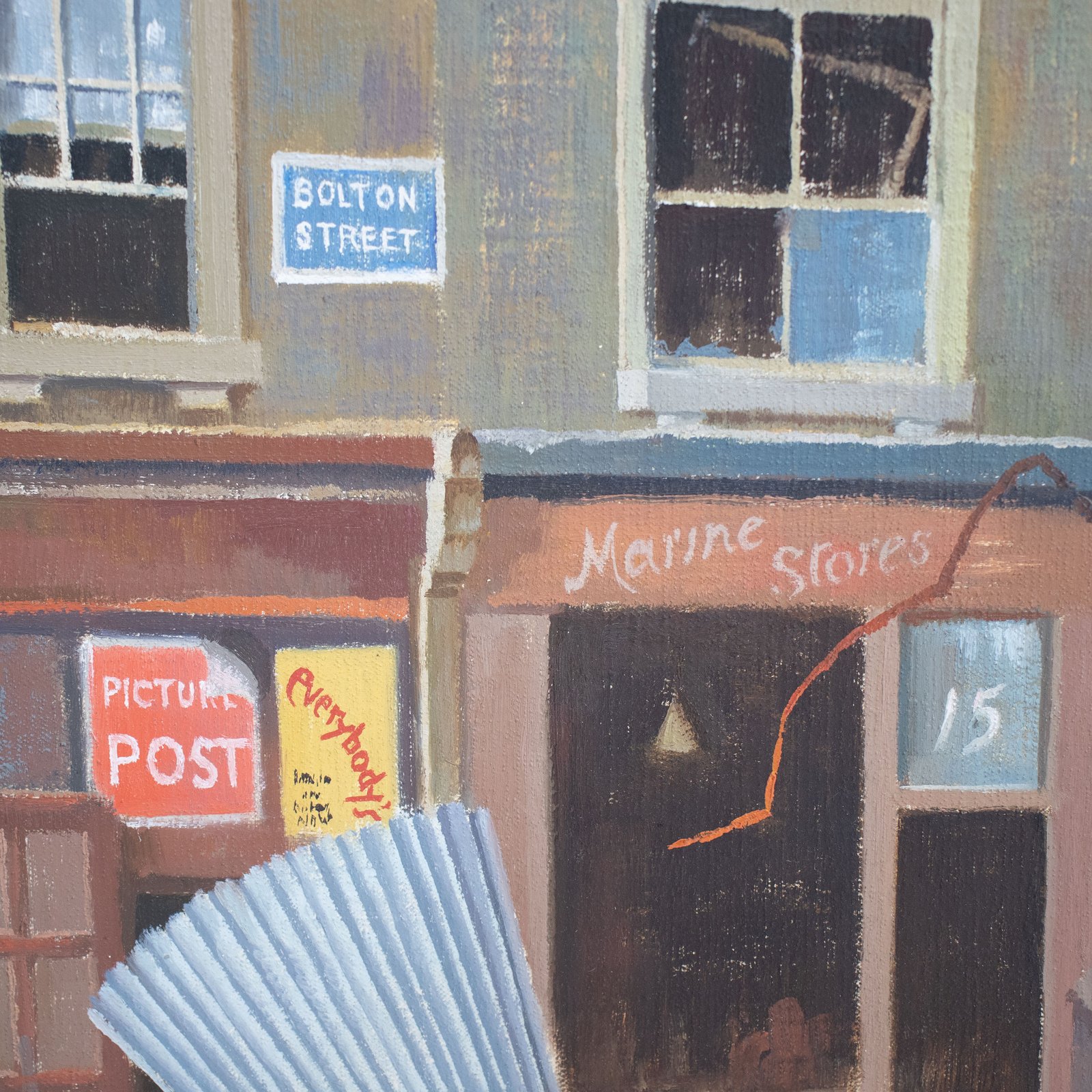 Clearly visible broken windows, signboards state: “Bolton Street”, “15”, “Marine Stores”, “Picture Post”, “Everybody’s…(text unclear)”. Landscape without people, dark smocked sky reflected in the snow, abandoned cart.