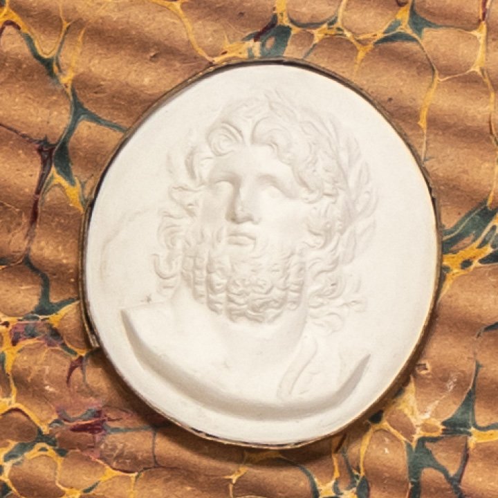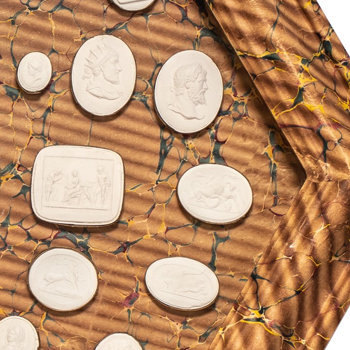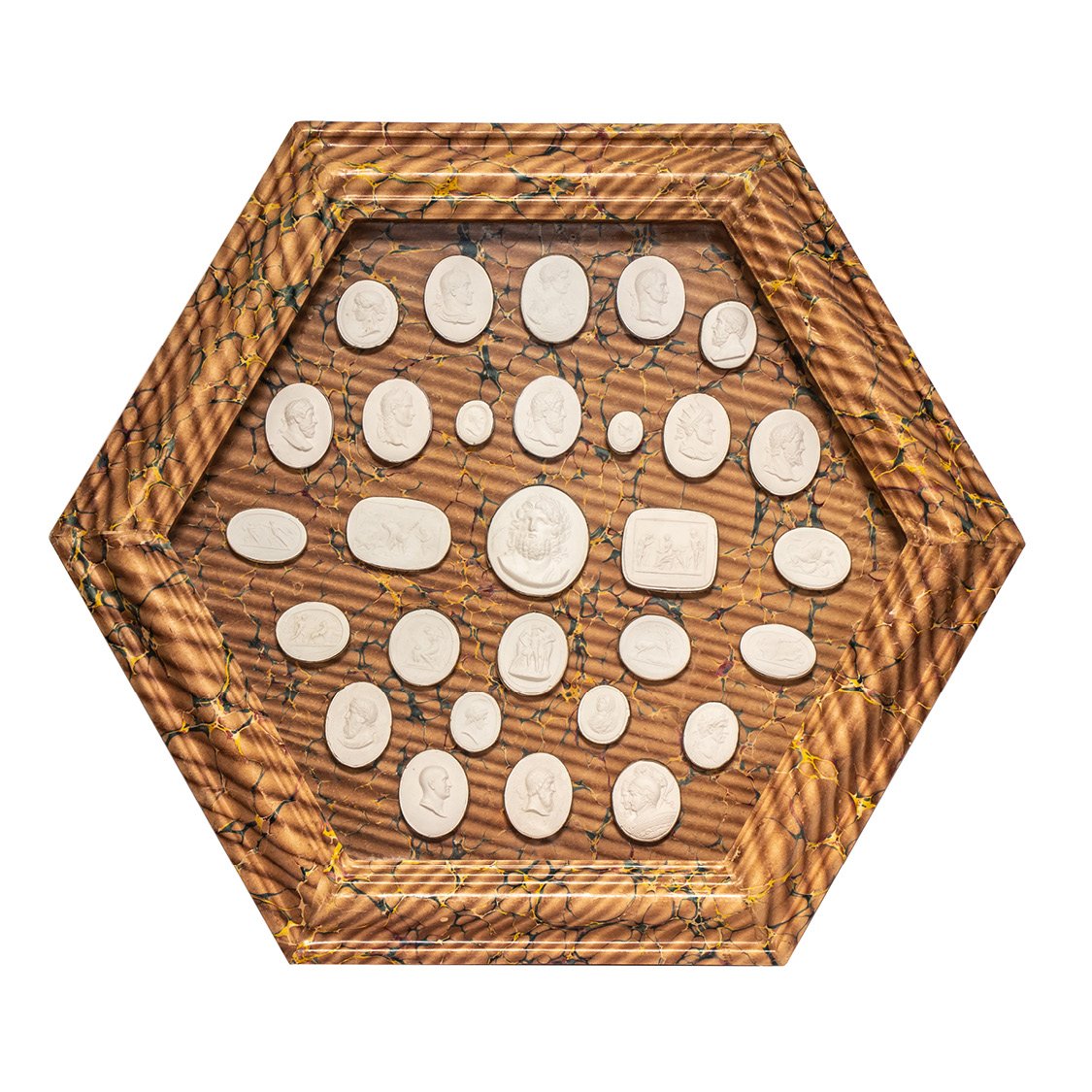 Set of plaster intaglios framed under glass in a hexagonal frame covered with brown marbled ‘Spanish wave’ paper. Each cameo is surmounted in brass and depicts Greco-Roman personalities and mythological scenes. The large round intaglio in the center depicts Jupiter, as the equivalent of the Greek Zeus.
