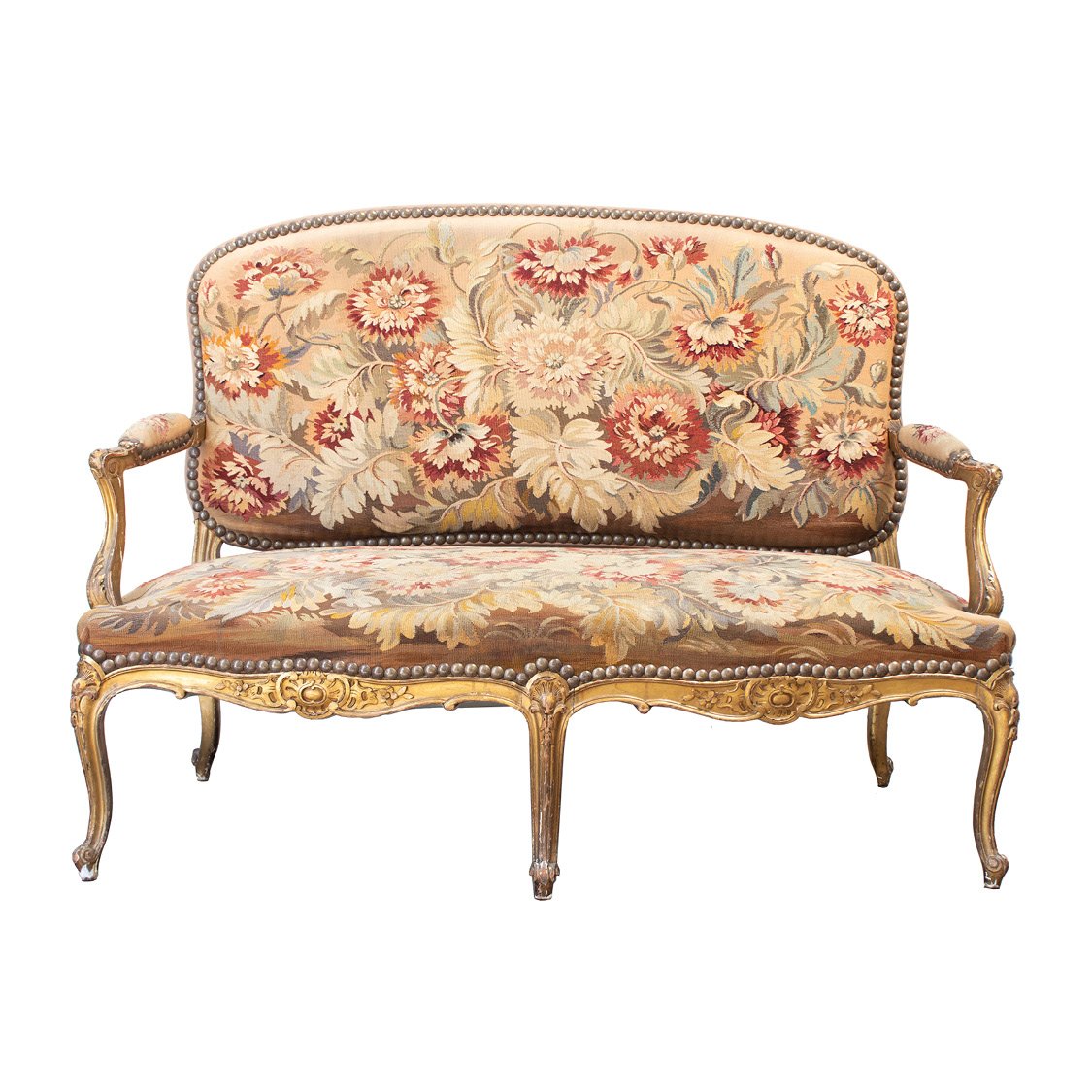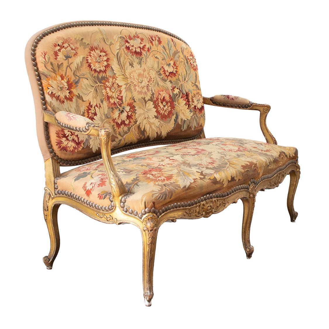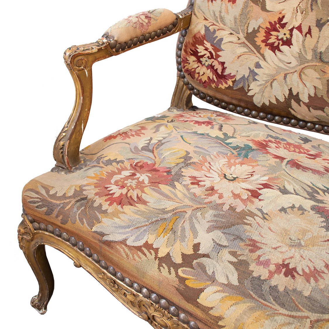 Canape sofa with a carved giltwood frame on 5 scroll feet and semi-upholstered armrests. Amazingly well preserved original Aubusson upholstery in floral pattern.