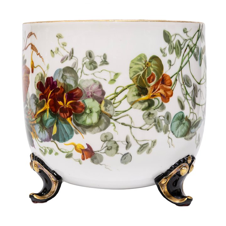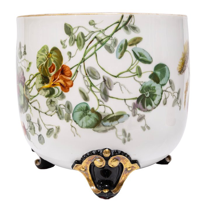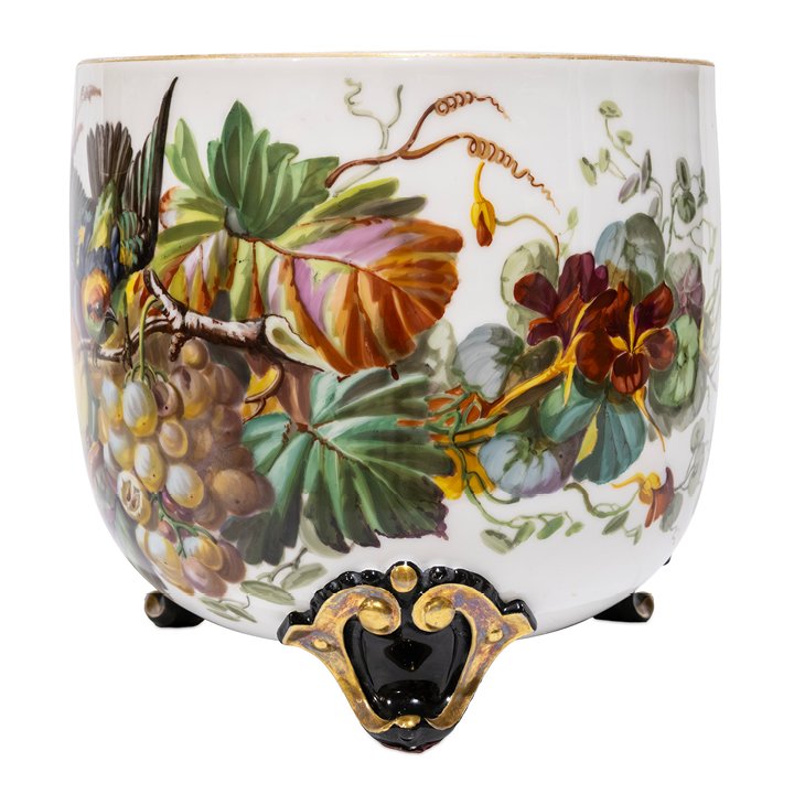 French ceramic bowl-shaped jardiniere with colorful hand-painted decor depicting a bird in a rural floral & fruit setting, on white background. Elevated on three black scroll feet, parcel gilt. Preserved in great antique condition.