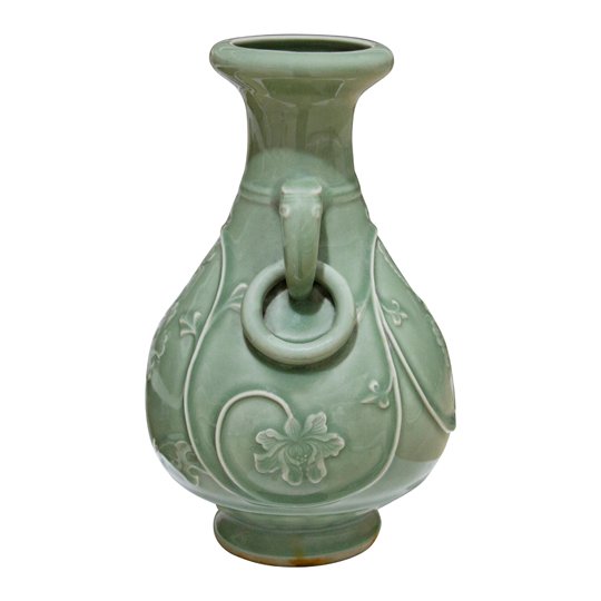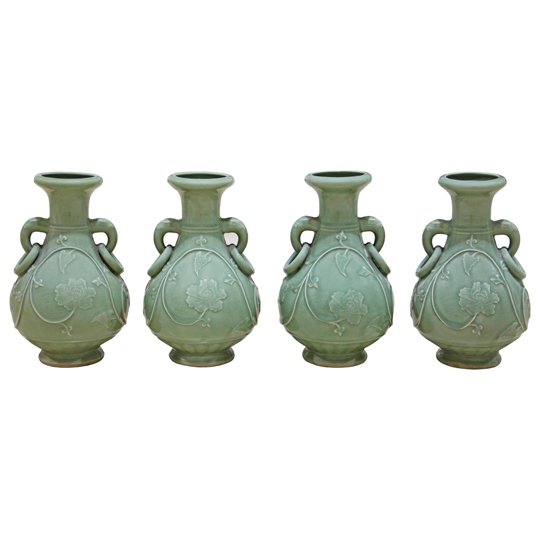 Chinese celadon vases with ring handle on either side and molded floral decorations on the body. May be purchased piece by piece or as a set of four. Great vintage condition, without visible chips or cracks.