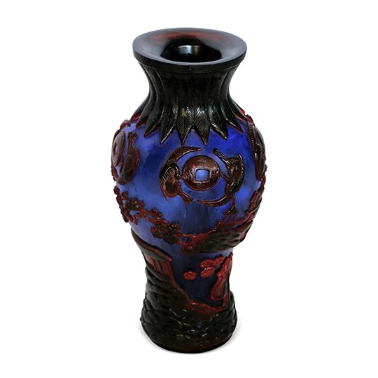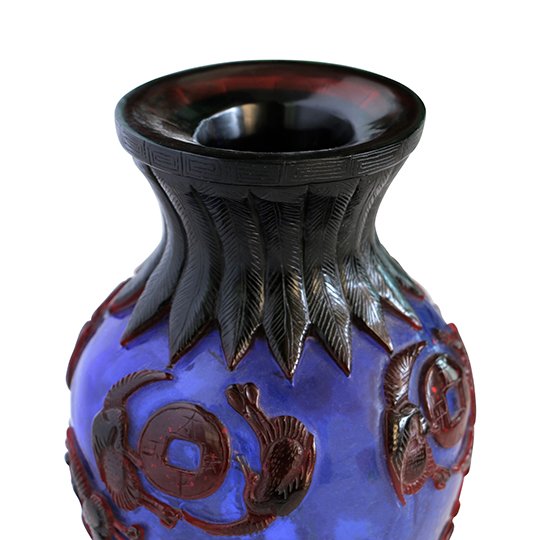 Peking glass dates back to the 18th century during the Qing Dynasty in China. The glass designs were created to imitate Jade and other stones. Even though glass making declined by the 19th century, there is still contemporary production. Depicts Chinese scenery. Typical of Chinese art, reign marks are on the bottom of the piece.