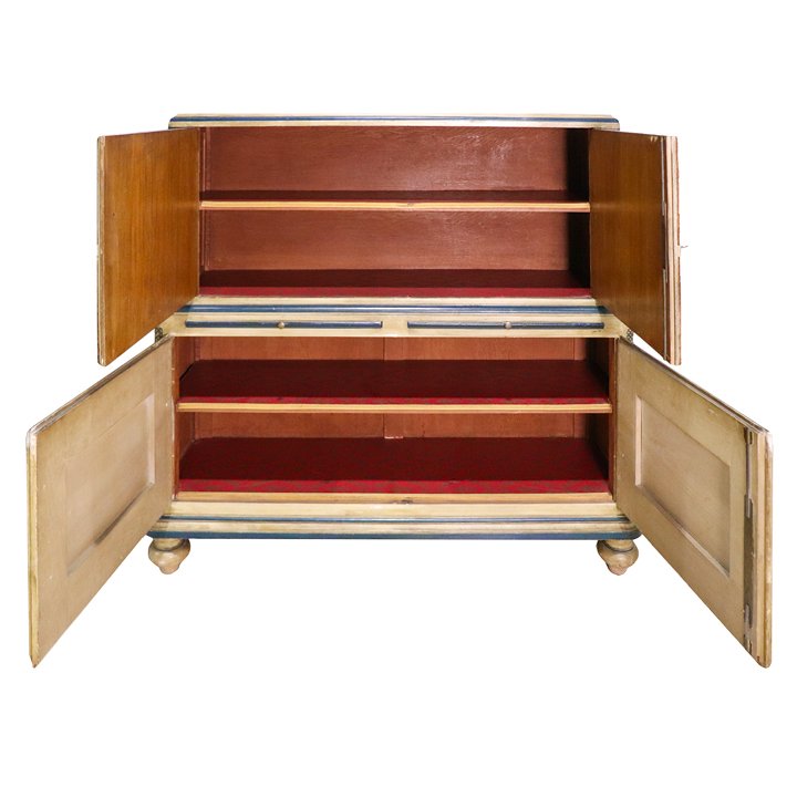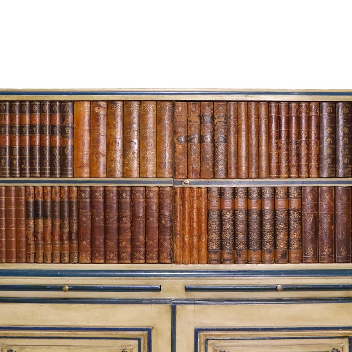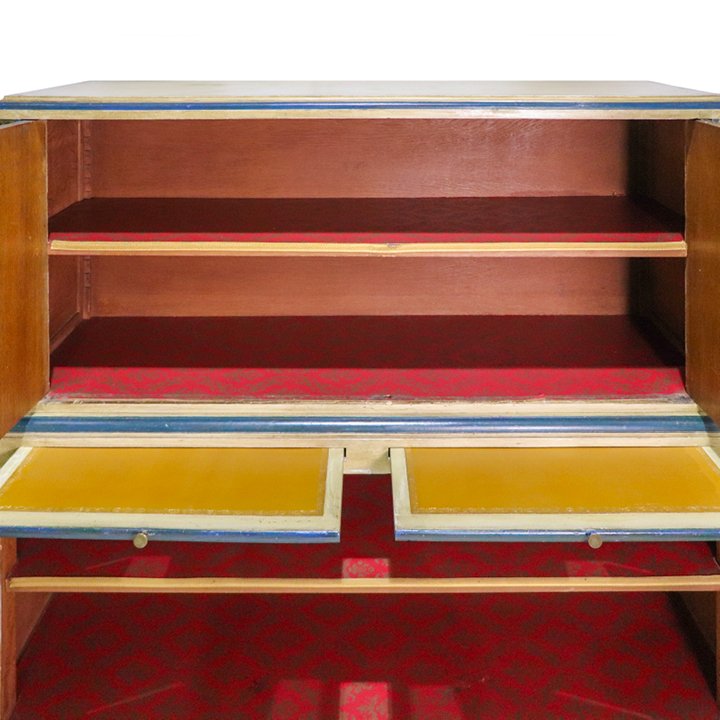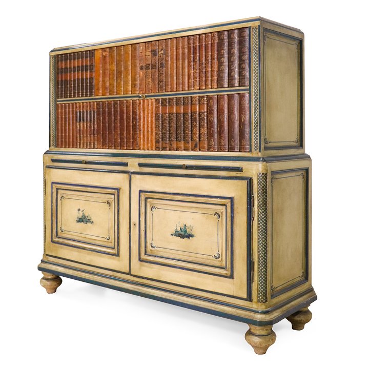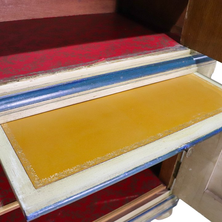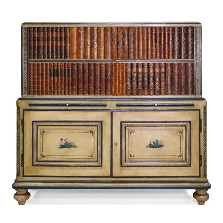French Chinoiserie painted cabinet with faux books in the upper section and two hand painted scenes on the two lower cabinet doors. The inside consists of one wooden shelf in the top part and another in the lower part. In the middle between the two parts, two secretaire drawers exist with a mustard leather surface. Probably produced by Maison Jansen.