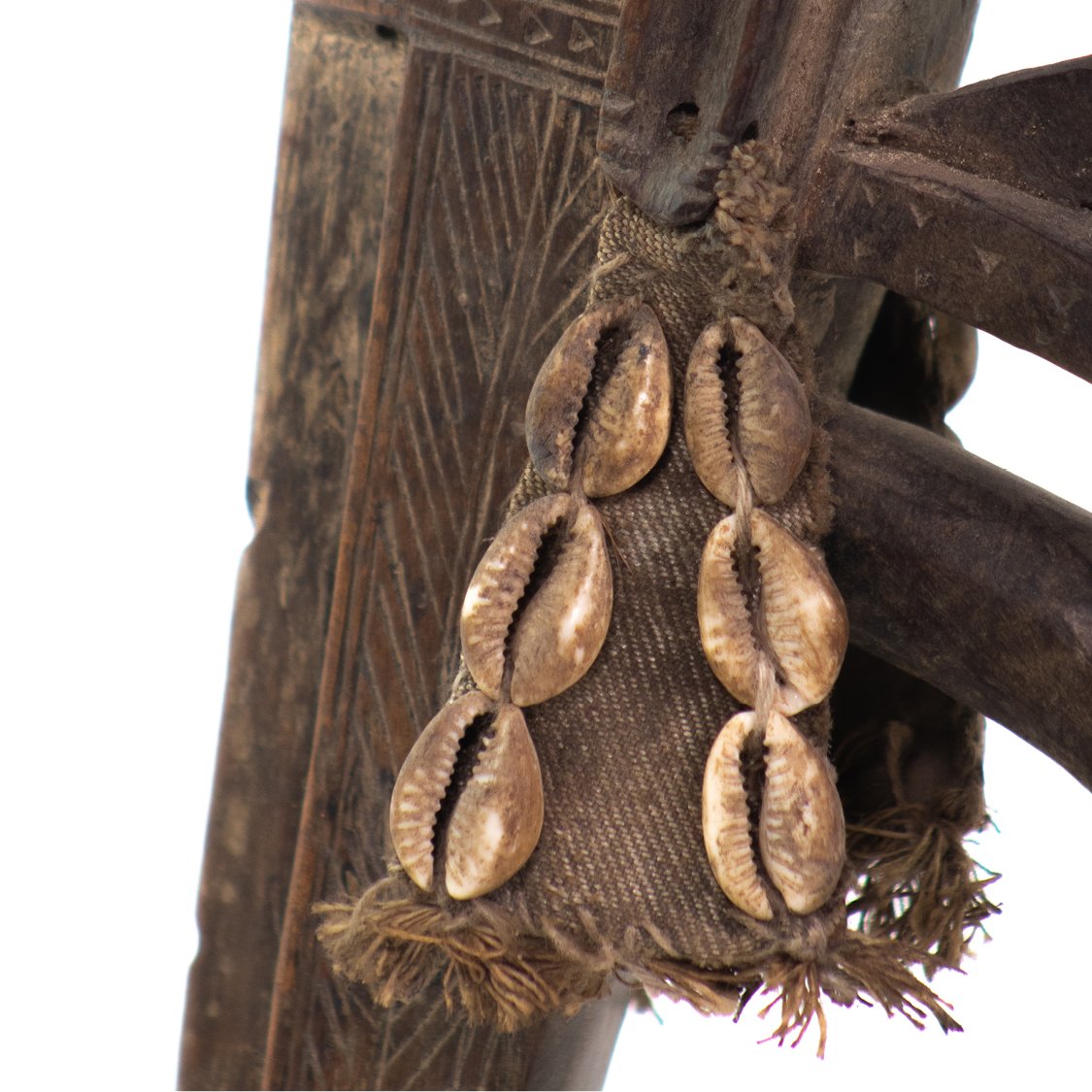 Traditional Bambara (Bamana) wooden antelope head hat adorned with fabric and seashells. This tribal headdress called Chiwara (Tyiwara) and represents the spirit that taught humans the fundamentals of agriculture.