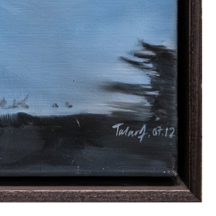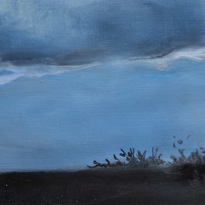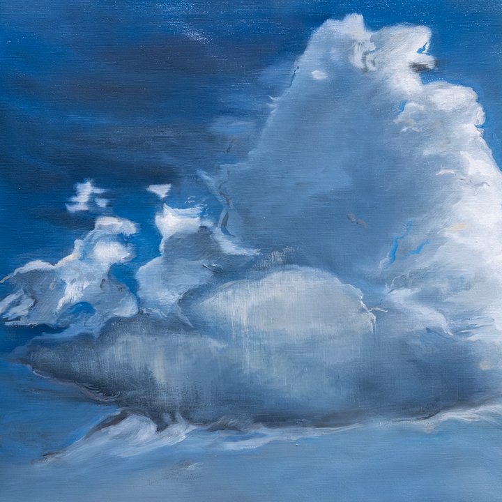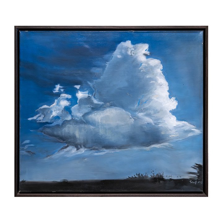 Contemporary painting in oil and resin perfectly flatted on canvas. It depicts a large cloud above a silhouette of ground with grass, in almost monochromatic blue hues, with visible dynamic brush strokes. The official title given by the artist is “Cloud Painting I”. Signed by the artist and dated 07 (July) 2012. Newly framed.