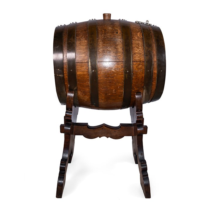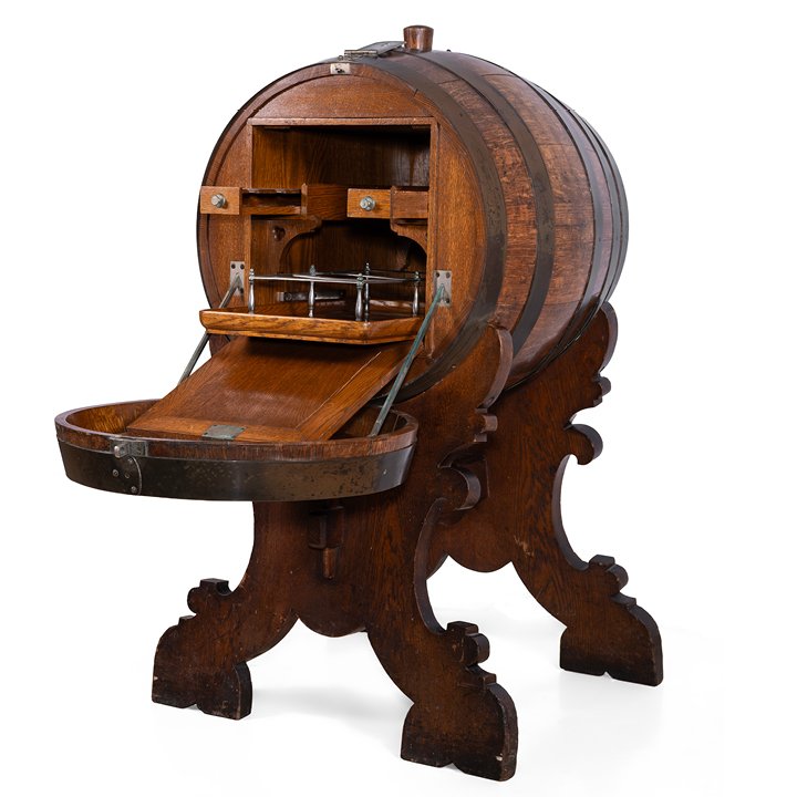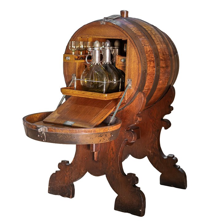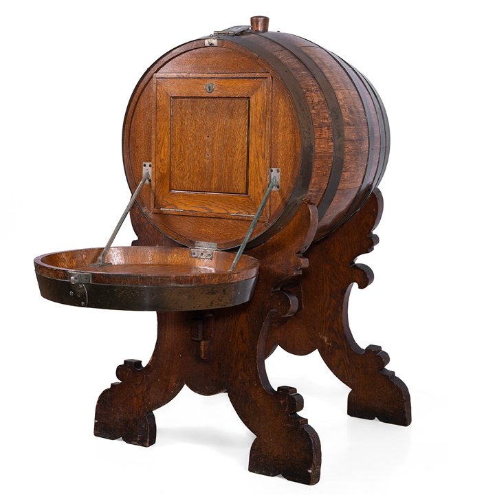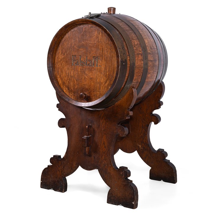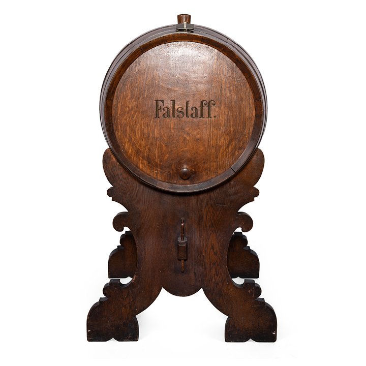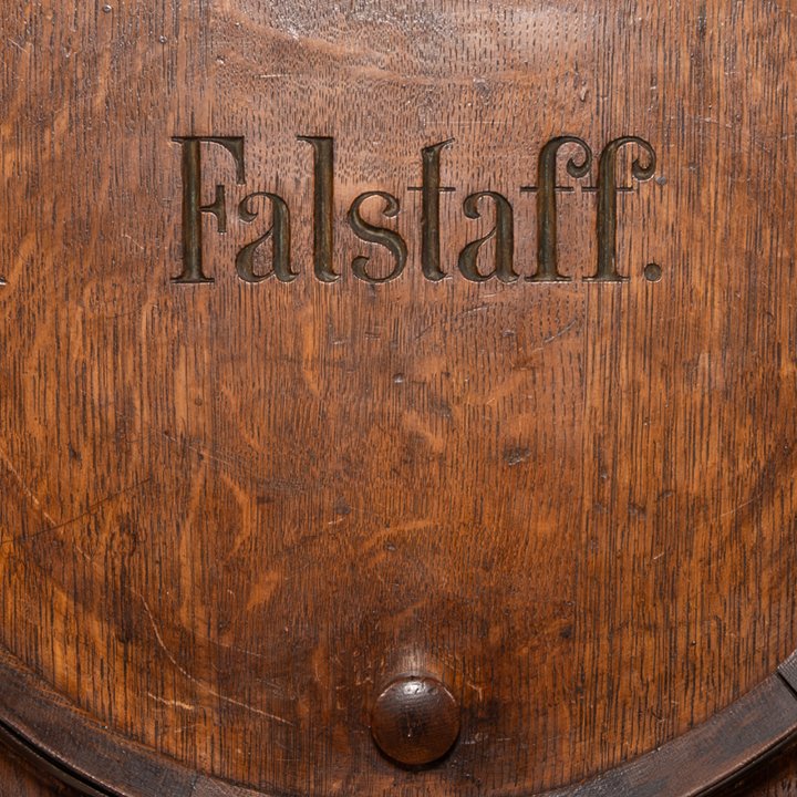 The text on the front of the barrel, Falstaff, refers to Sir John Falstaff, the jovial, wine-loving character from Shakespeare’s plays. By the late 19th century, his name symbolized good humor and indulgence, often used for pubs, breweries, and barware. On this cabinet, the inscription evokes conviviality and the pleasure of drinking in good company.