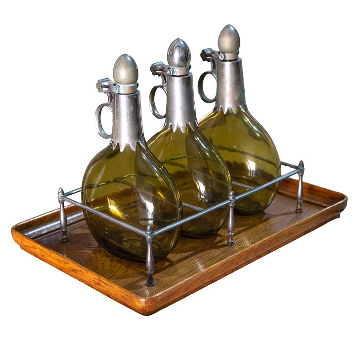 A continental oak liqueur cabinet of coopered barrel form, mounted with plated copper bands and fittings, set on a shaped oak stand. The hinged front, inscribed (Falstaff), opens to reveal a fitted interior with a sliding tray divided into three compartments, flanked by retractable glass holders on each side. The set includes three blown amber-glass decanters with plated collars and hinged stoppers, together with nine liqueur glasses on domed bases.