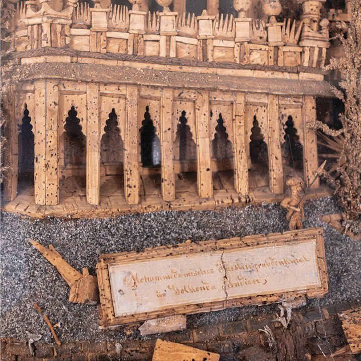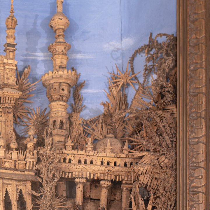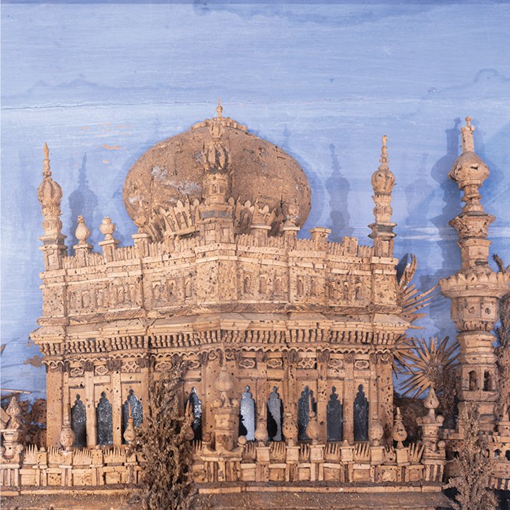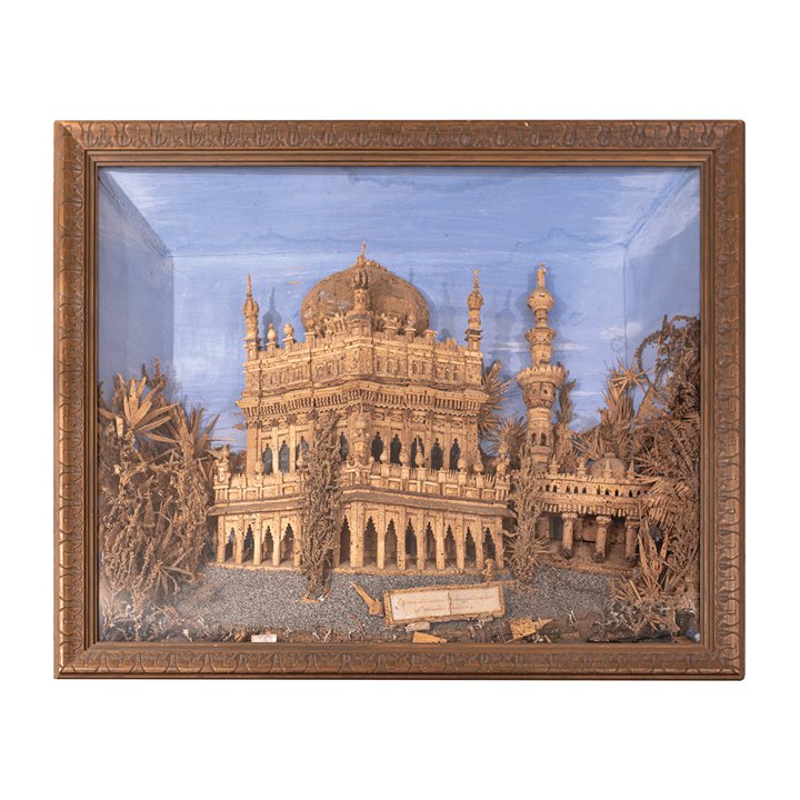 German cork relief diorama depicts Temple at Golconda, Hyderabad - India. The artwork is full of marvelous architectural details. Plaque on the bottom inscribed: "Mohammedamisches *ars*tngrabdentrsnal in Golkonda Indien".
