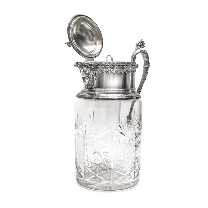 A cut crystal jug with silver-plated handle and lid mount in Victorian style. The hinged lid is crowned with a sculptural finial depicting a cherub riding a swan, the handle is cast in the form of a grotesque mask issuing floral swags and scrolling foliage. The body is decorated with deep geometric cuts and fan motifs typical of late 19th-century glasswork.
