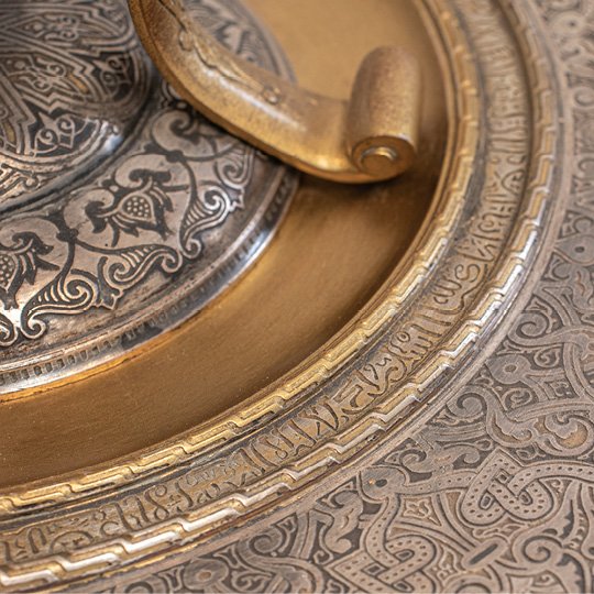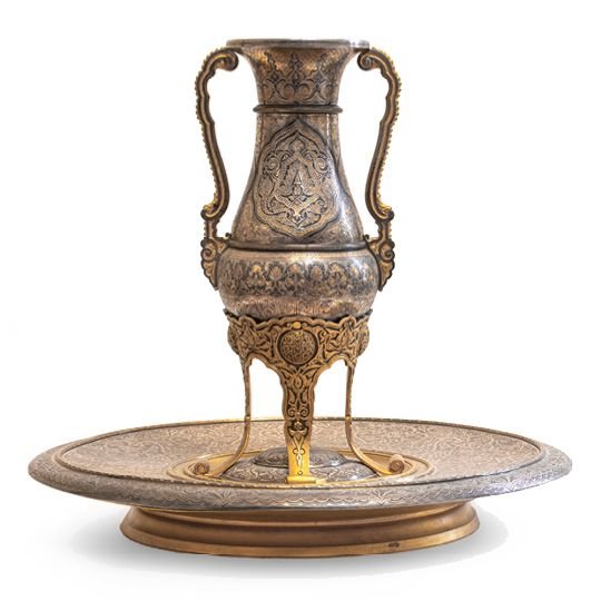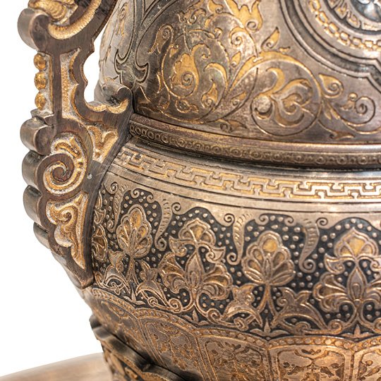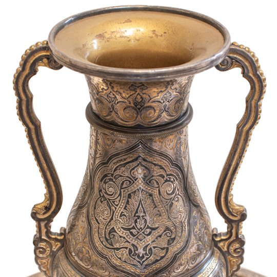 A French vase on a plate stand, made of gilded and silvered bronze with niello inlay. It is designed in the Persian Orientalist style, featuring a baluster shape, twin handles, and flared rim, supported by four scrolls. The circular base has a shallow dome in the center and is decorated with formal, repeating patterns of flowers, geometric shapes, and leaves.